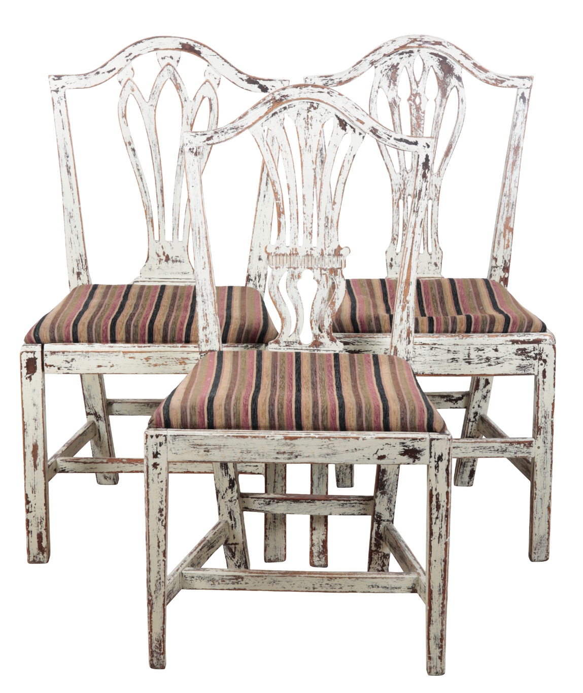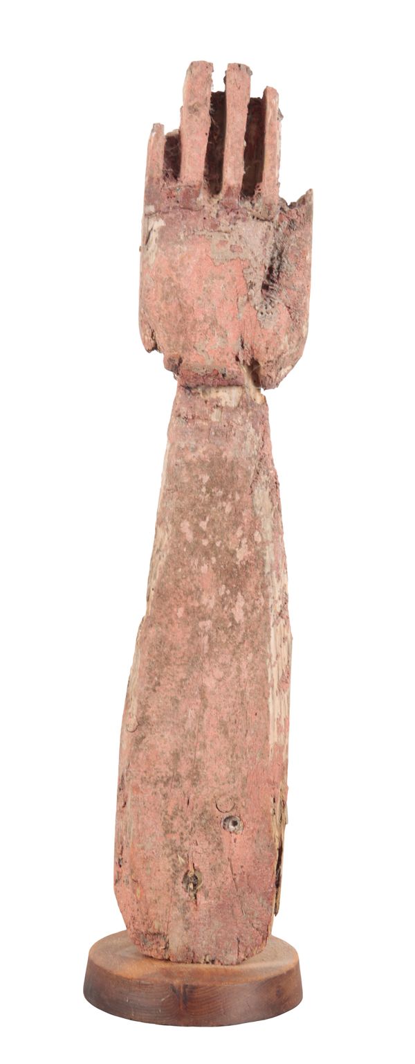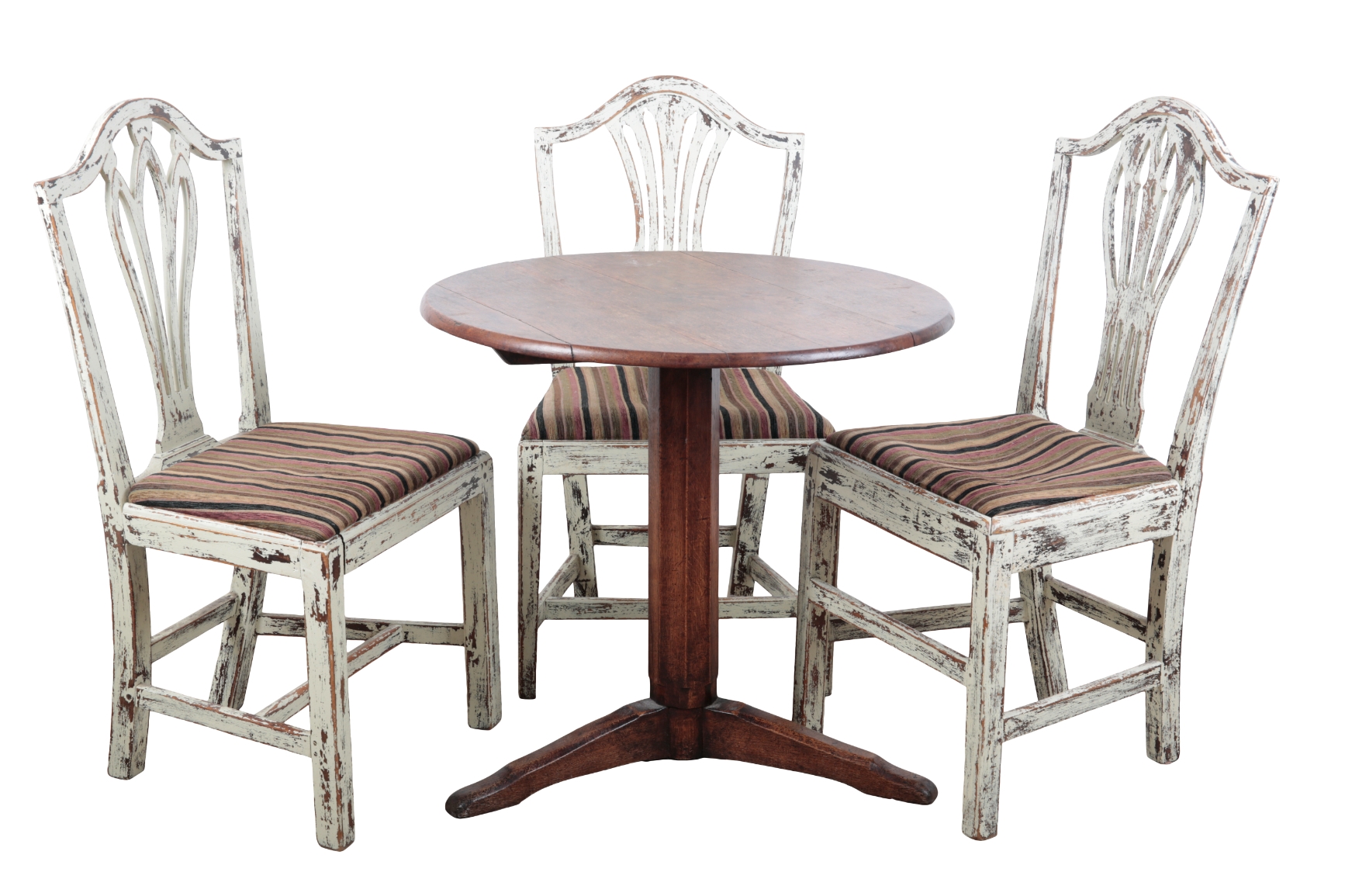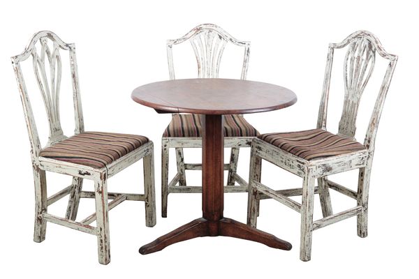 the circular top above an octagonal column terminating on a tripod foot, 72cm high x 86cm diameter; together with three painted side chairs; and a carved painted wooden hand sculpture on a turned wooden base, 53cm high (5)