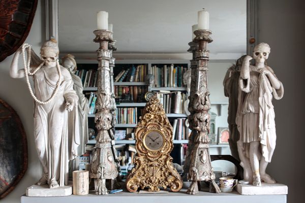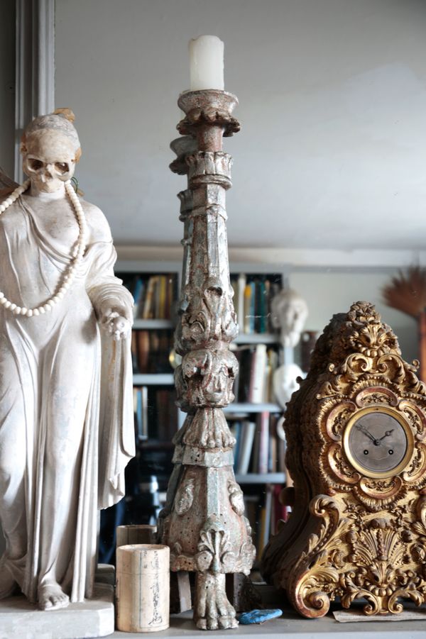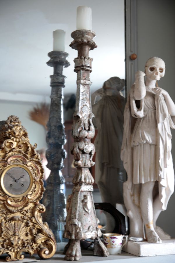 A PAIR OF TALL GREY PAINTED AND CARVED WOOD PRICKET CANDLESTICKS