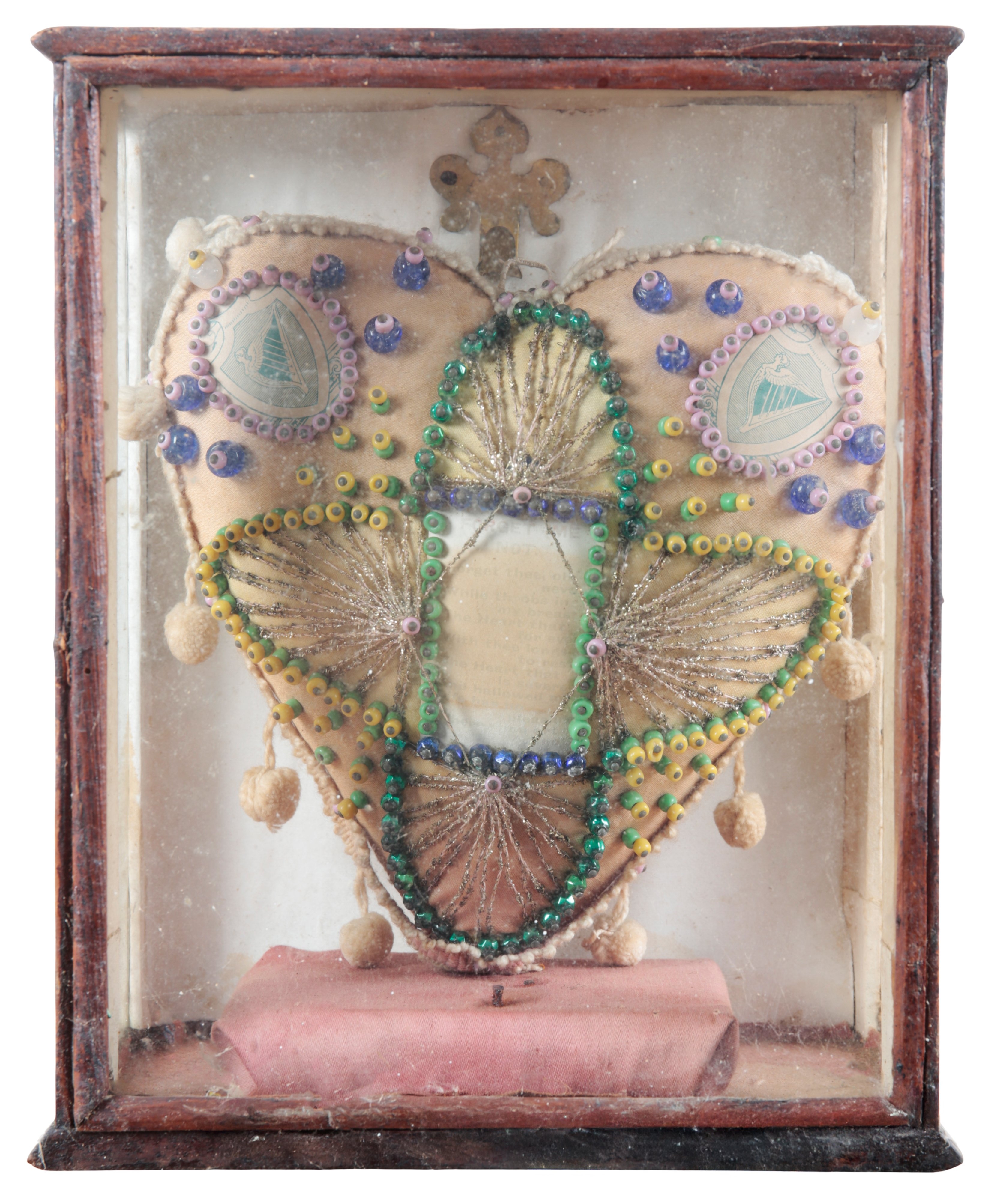 late 19th/early 20th century, the central rectangular panel with printed silk poem 'Forget Me Not' surrounded by beadwork ornaments, the upper left and right corners with Irish harp, 16cm high x 16cm wide, contained in a stained wood and glazed case