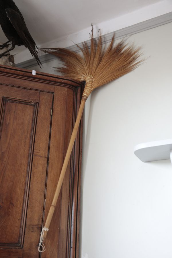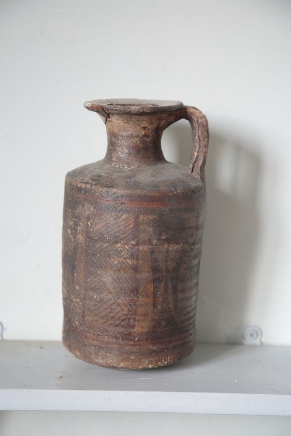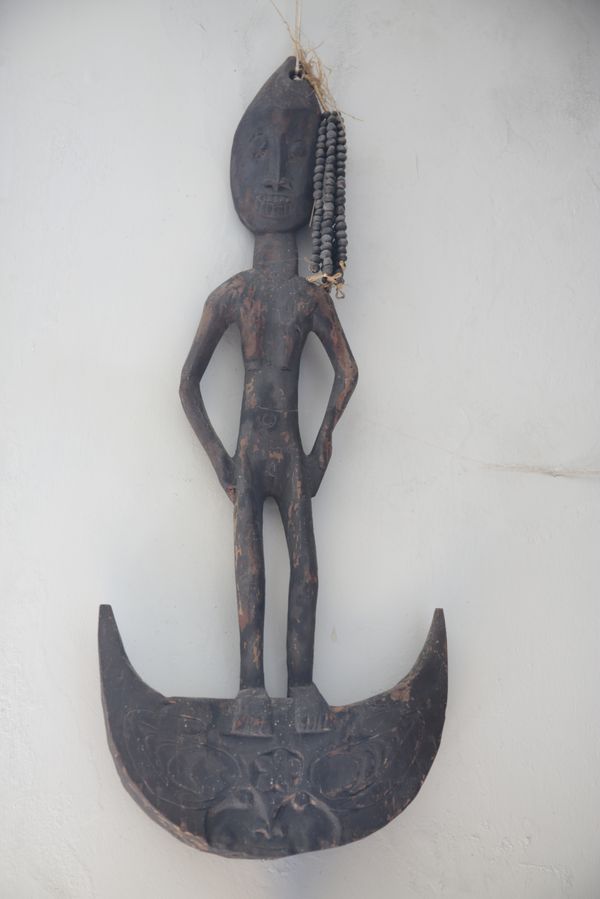 mounted on a sheep skull, 37cm high; together with an African pendant figure, 66cm high x 27cm wide; a fly whisk, 96cm high; and an African pottery water jug, 26cm high x 14cm diameter (4)