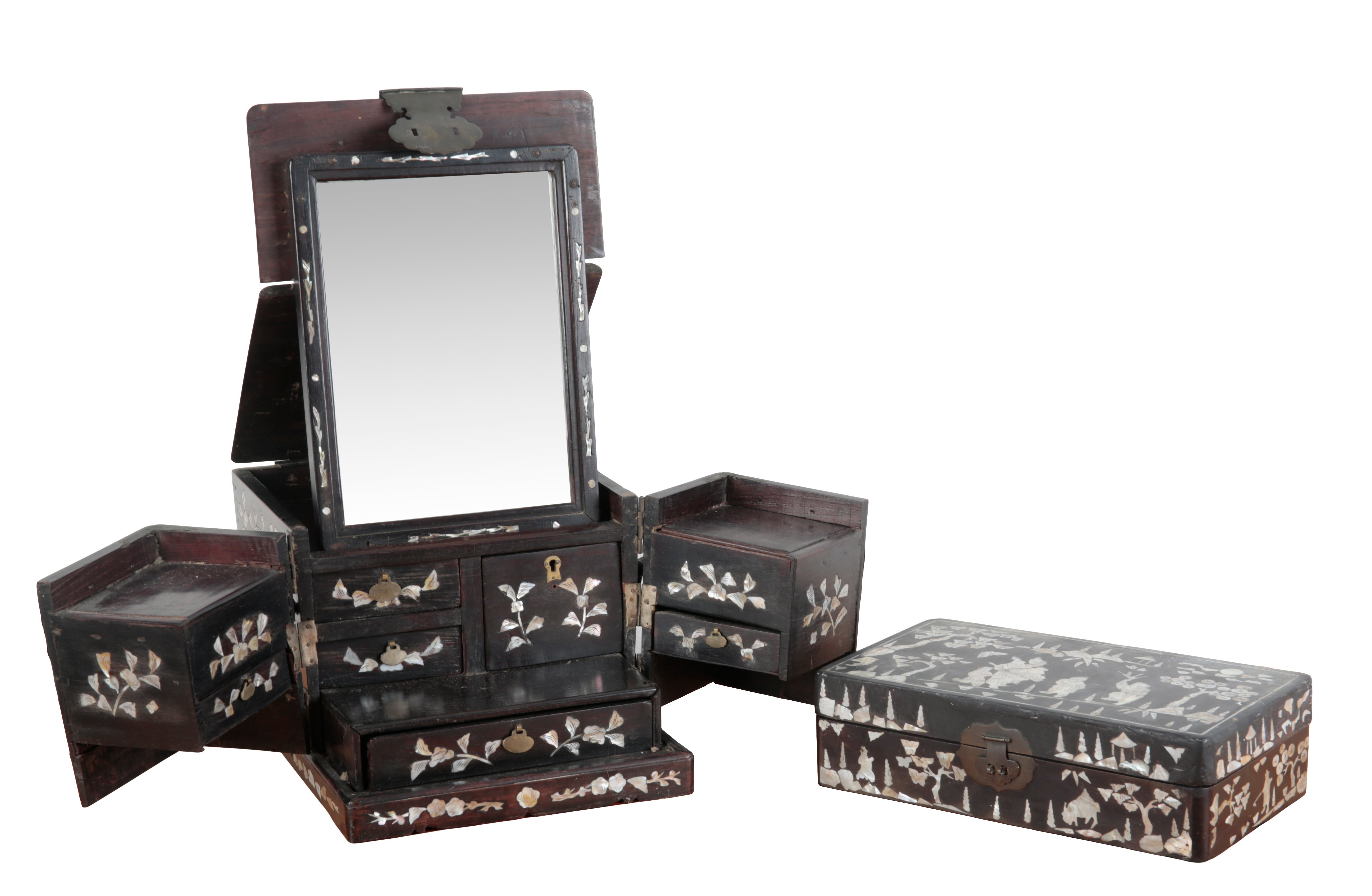 A CHINESE HARDWOOD VANITY OR DRESSING TABLE BOX