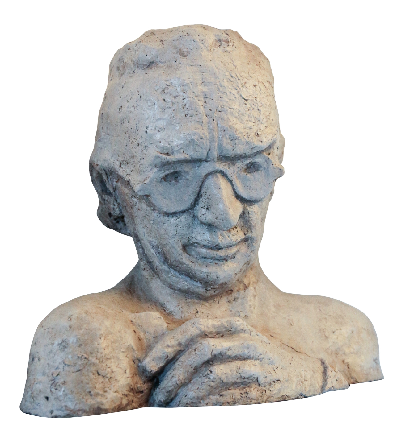 grey painted pottery, the sitter depicted wearing glasses and with swept back hair, 36cm high x 45cm wide x 24cm deep, apparently not signed or titled