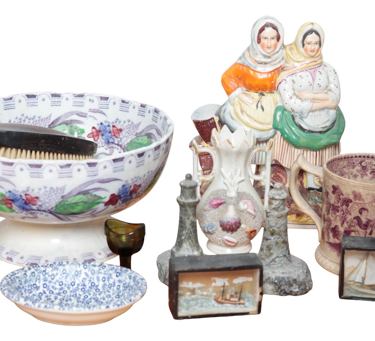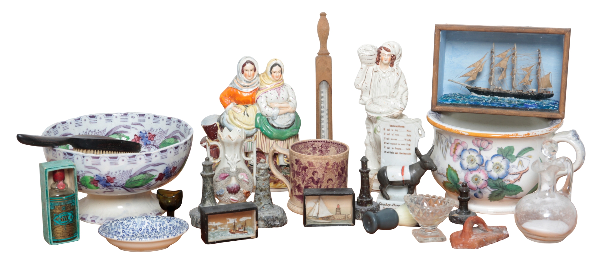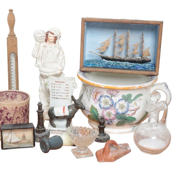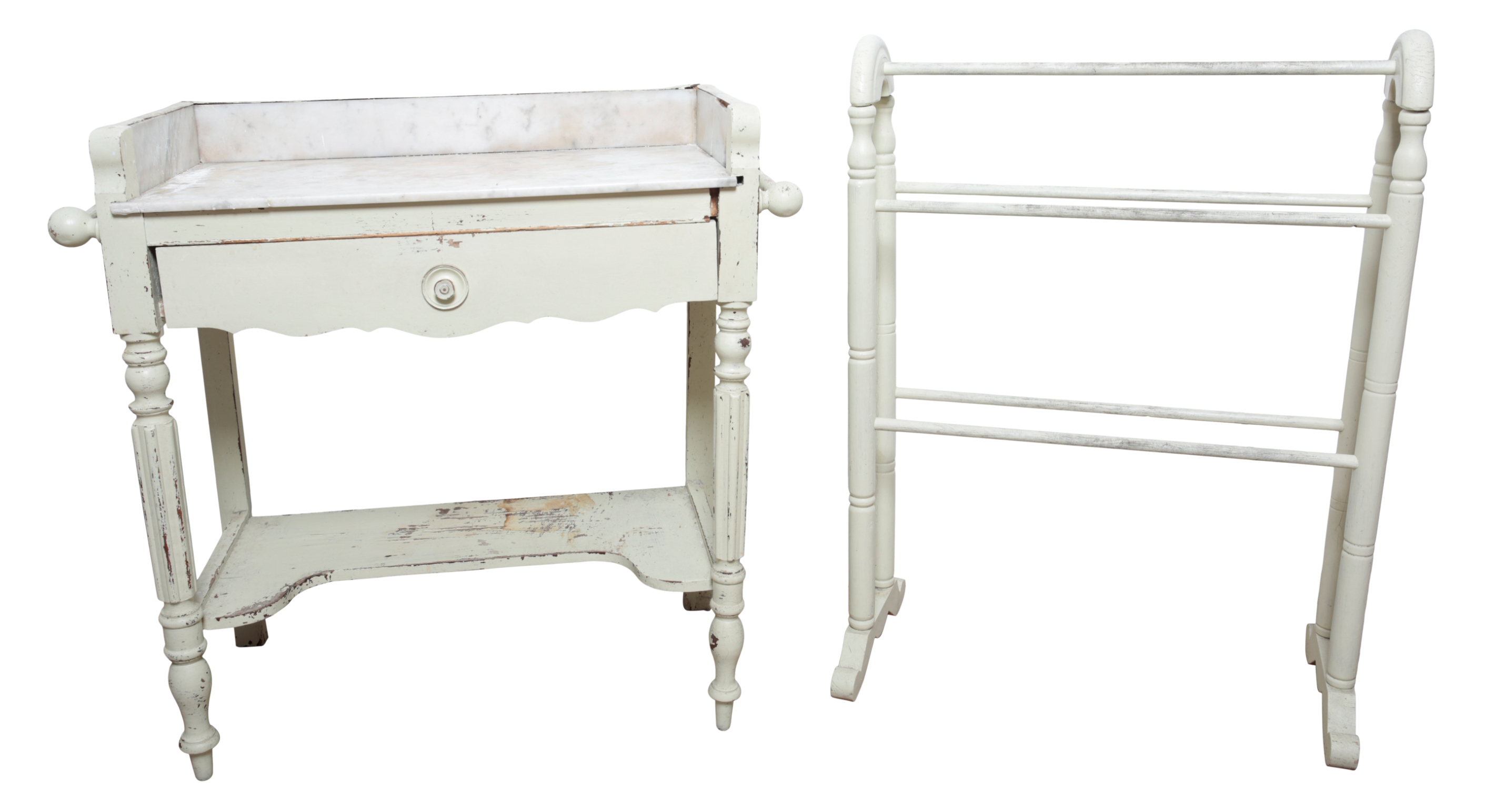 late 19th century, with white marble top, marble-lined gallery and twin handles, fitted with a single drawer, on turned legs and low undertier; together with a cream painted towel airer; a collection of decorative items including a Victorian fruit bowl containing natural sponges, three model ships contained in glazed cases, four serpentine stone lighthouses; and mixed other items (a lot)