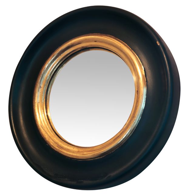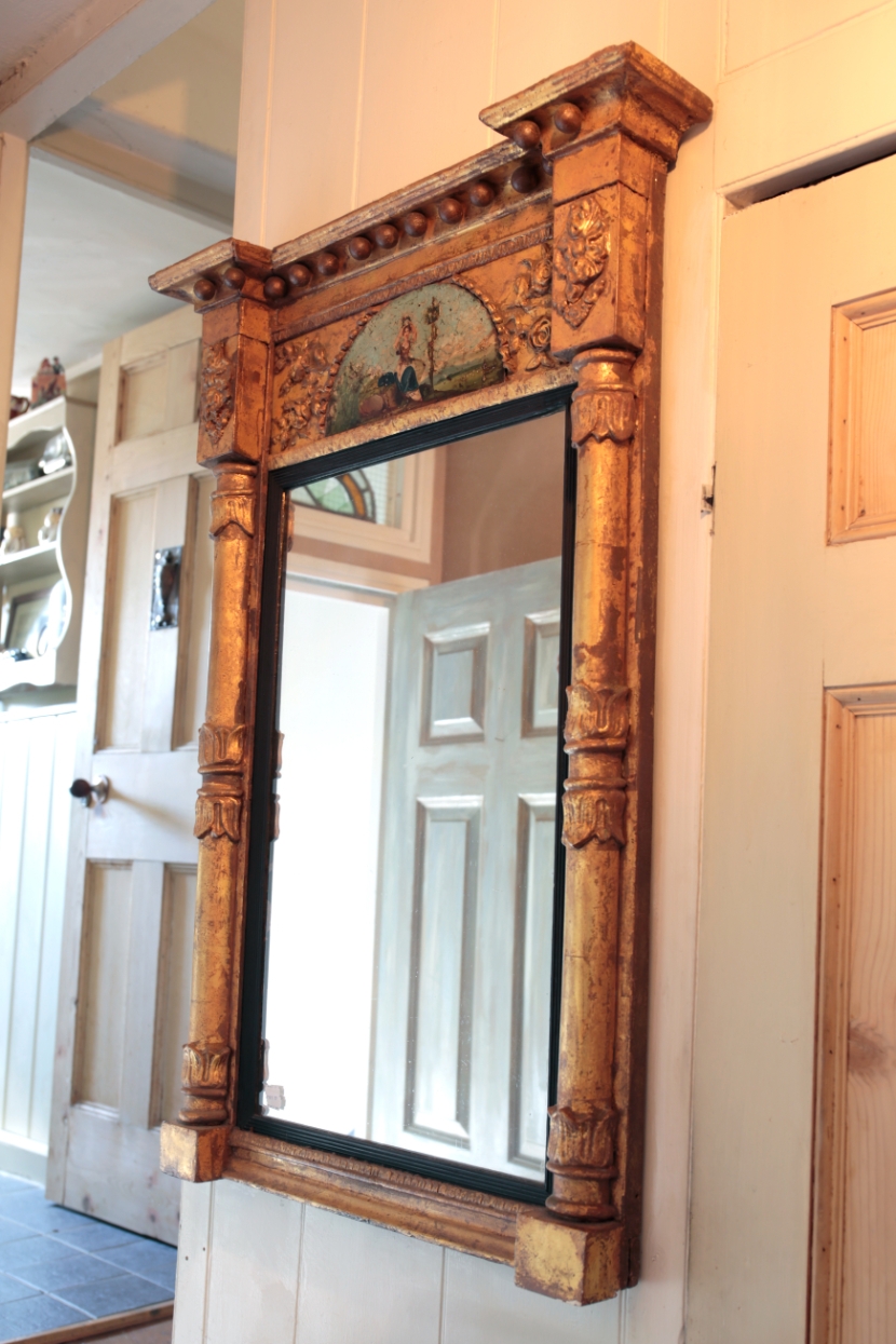 early 19th century, the cornice with ball ornament, the frieze painted with a seated female figure holding a floral wreath, with leaf-capped split-turned columns and reeded ebonised inner slip, 97cm high x 68cm wide x 12cm deep; together with an ebonised circular wall mirror of 19th century style with gilded inner slip, 29.5cm diameter (2)