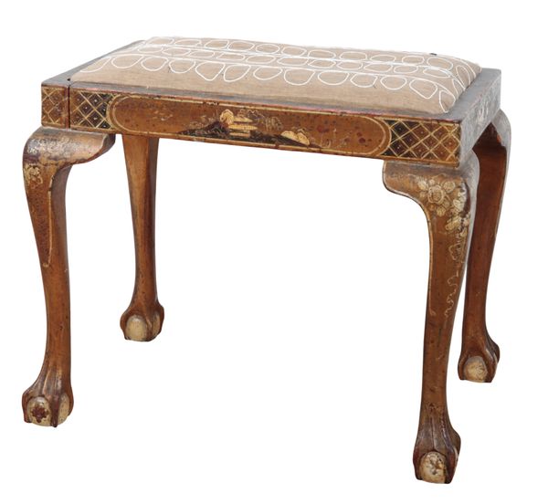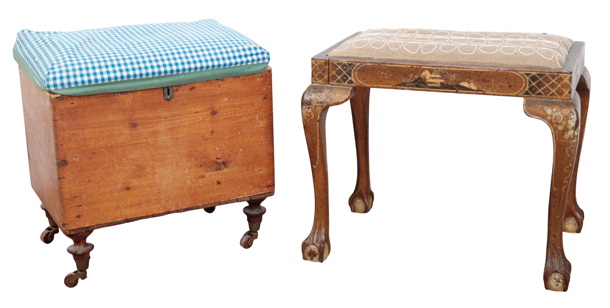 with embroidered seat, the frieze and cabriole legs decorated with flowers and trelliswork, on claw and ball feet, 46cm high x 54cm wide x 37cm deep; together with a 19th century pine box stool, the lifting lid with later blue and white gingham upholstery, on short turned legs and brown ceramic castors, 46cm high x 46cm wide x 33cm deep (2)