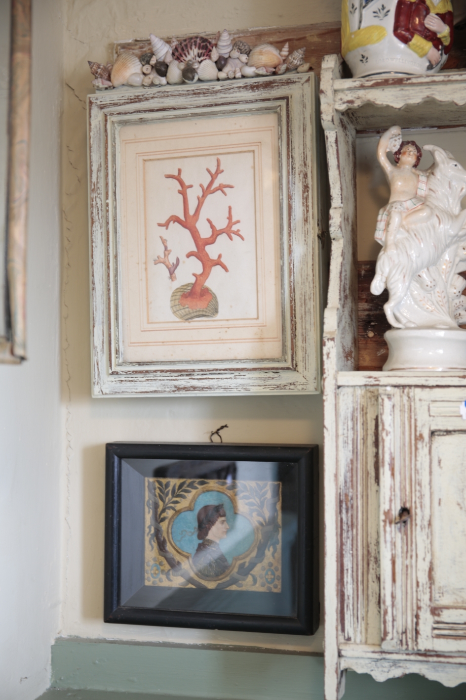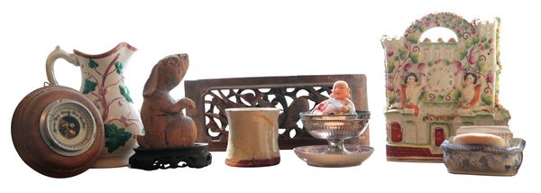 with shell cresting, the glazed door inset with coral watercolour, 34cm high x 23cm wide x 6cm deep; together with a collection of decorative objects including a painted and carved wood figure of a seated rabbit or hare, 17cm high, on associated Chinese carved ebonised wood stand (a lot)