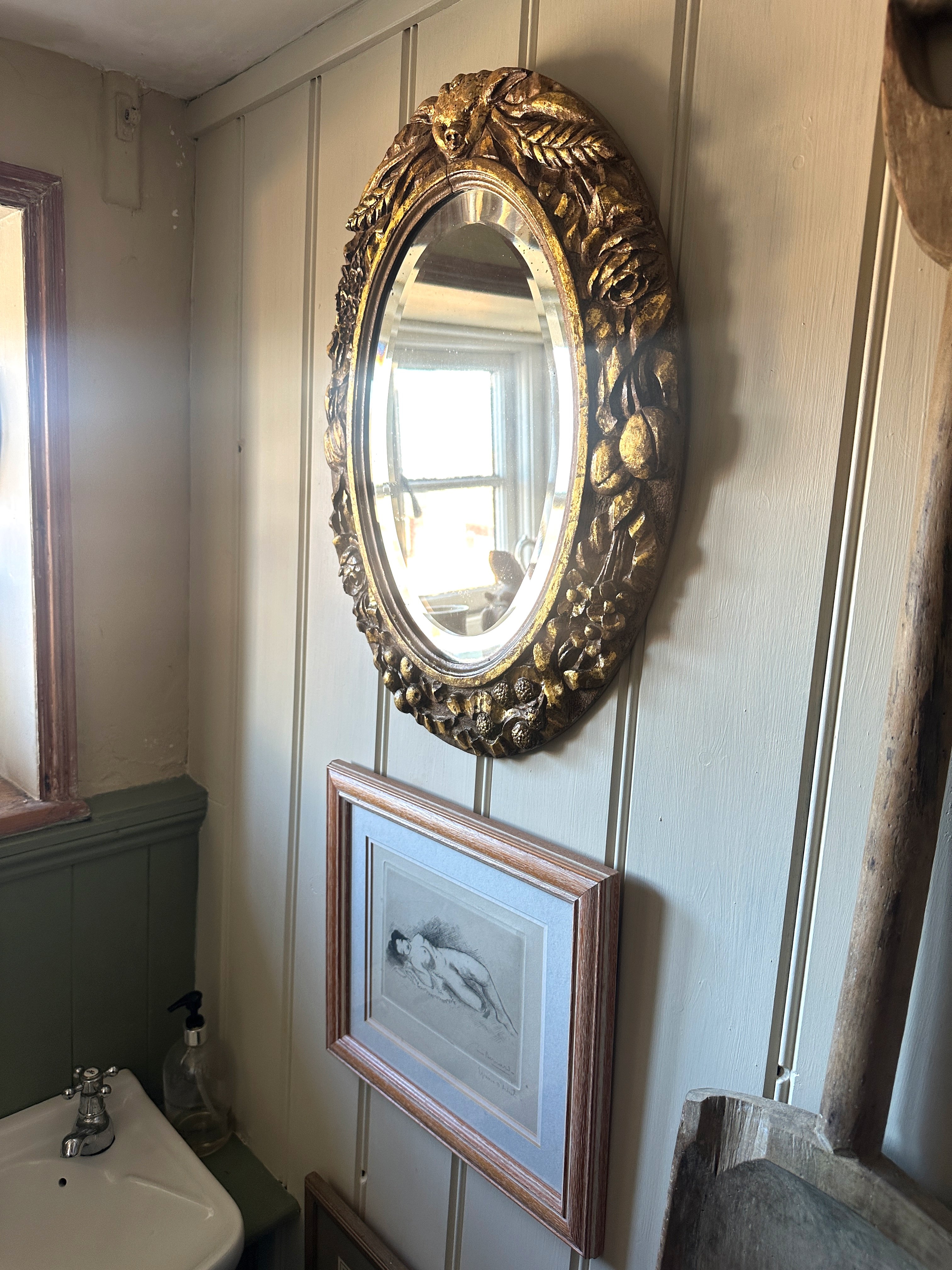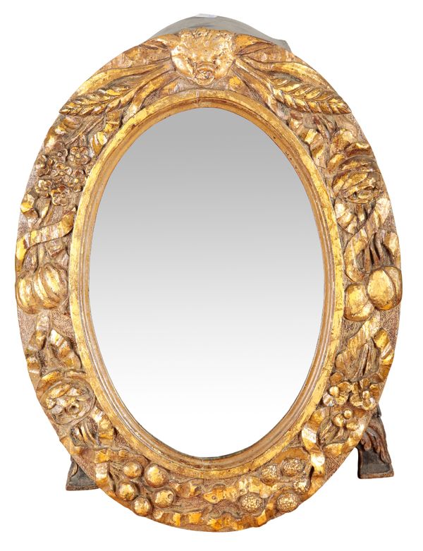19th century, carved in solid oak with boar cresting and harvest motifs of wheat, fruit and flowers, with a bevelled mirror plate, 50cm x 39cm