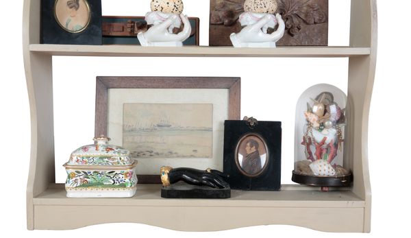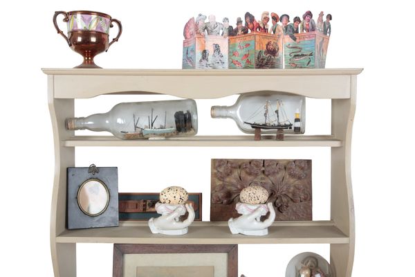 with shaped frieze and sides, fitted with three open shelves, 66cm high x 61cm wide x 15cm deep, supporting an interesting collection of objects, including three model ships contained in two bottles, a pair of late 19th century continental 'hand' table salts, each containing a painted ceramic egg, a marine diorama contained under a glass dome, with ebonised base and a selection of other decorative items (a lot)