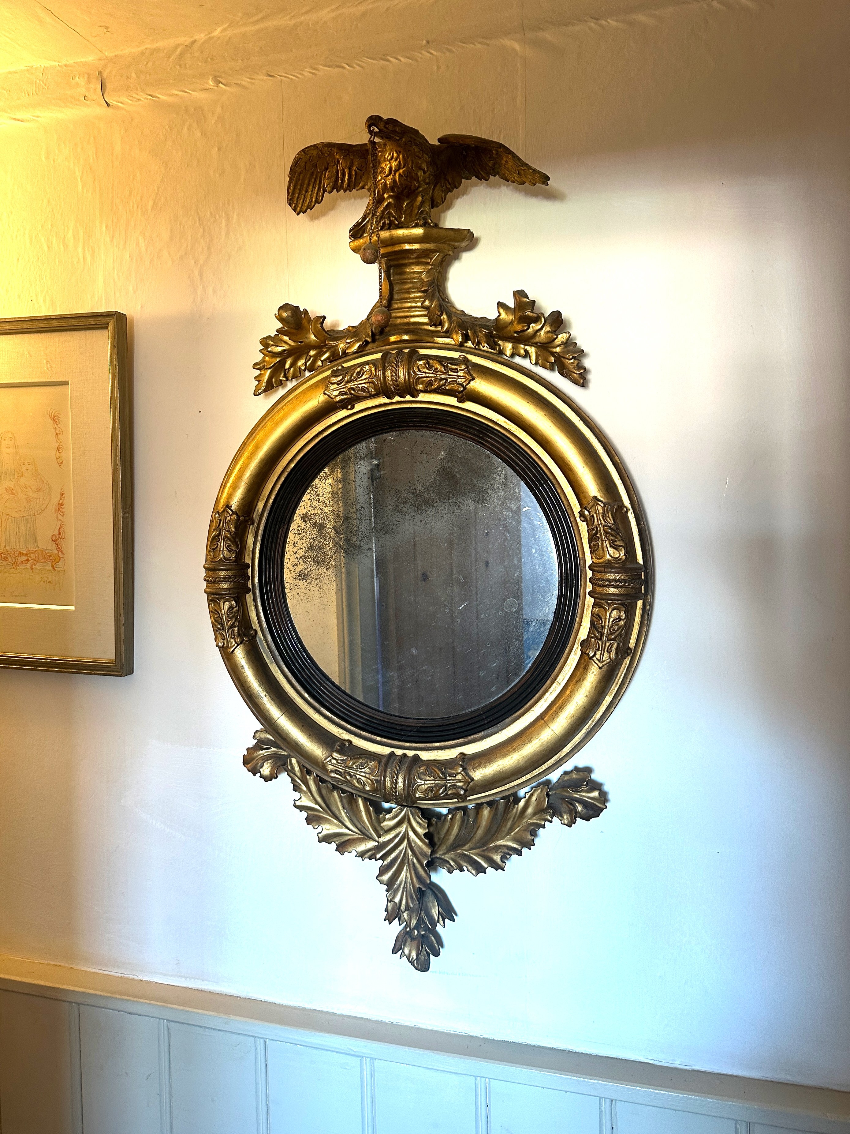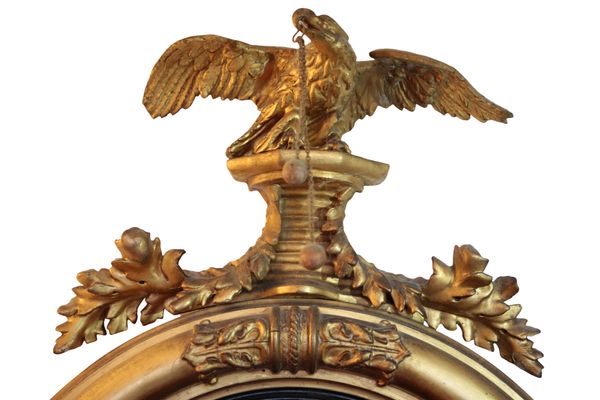with eagle and leaf cresting, the moulded border with reeded ebonised inner slip and with leaf apron, 92cm high x 52cm wide