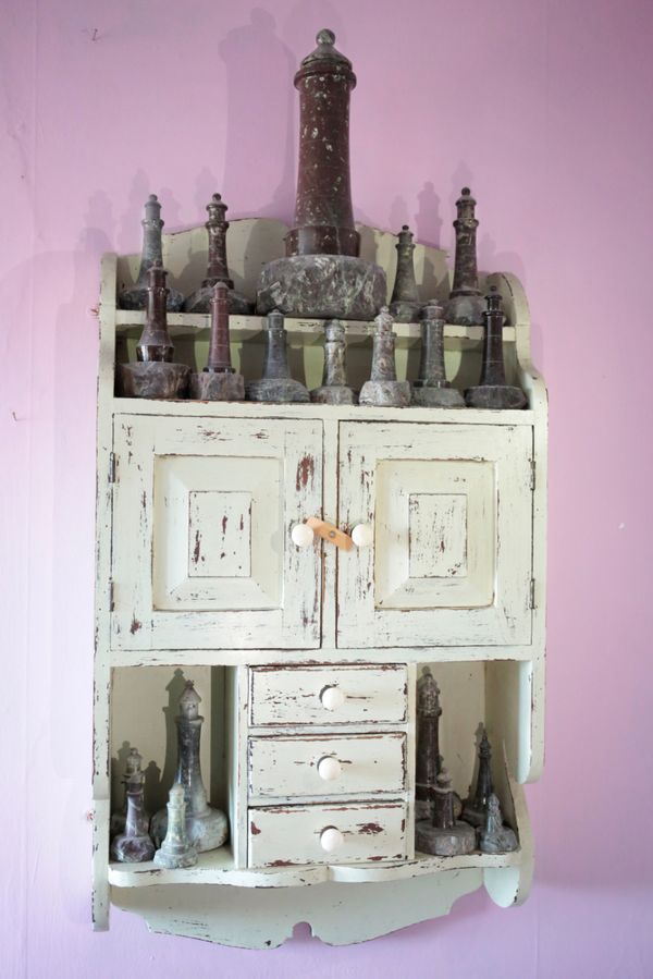 enclosed by a pair of doors with three small drawers below, 74cm high x 44cm wide x 14cm deep, supporting a collection of serpentine stone lighthouses, the largest 31cm high (a lot)