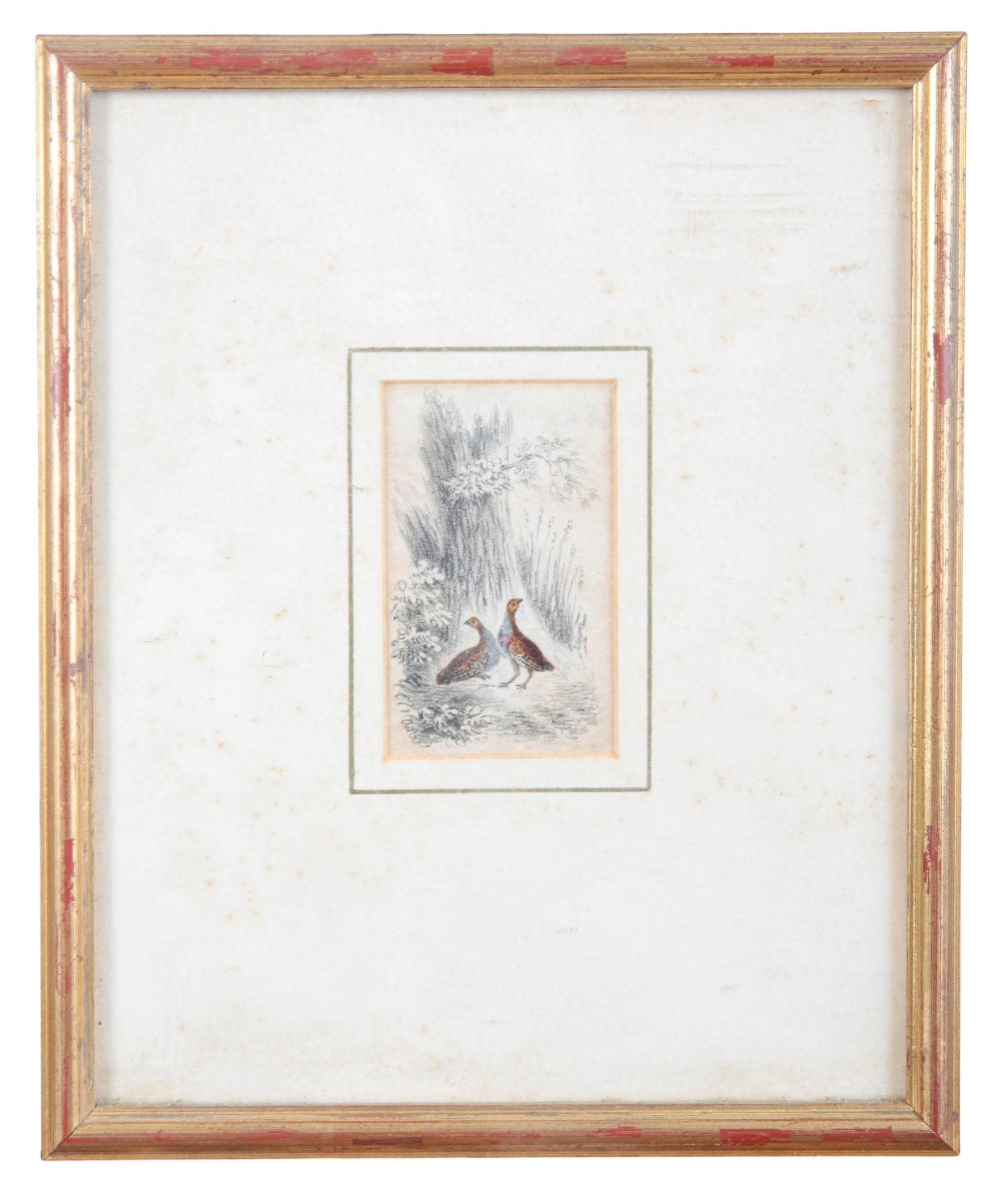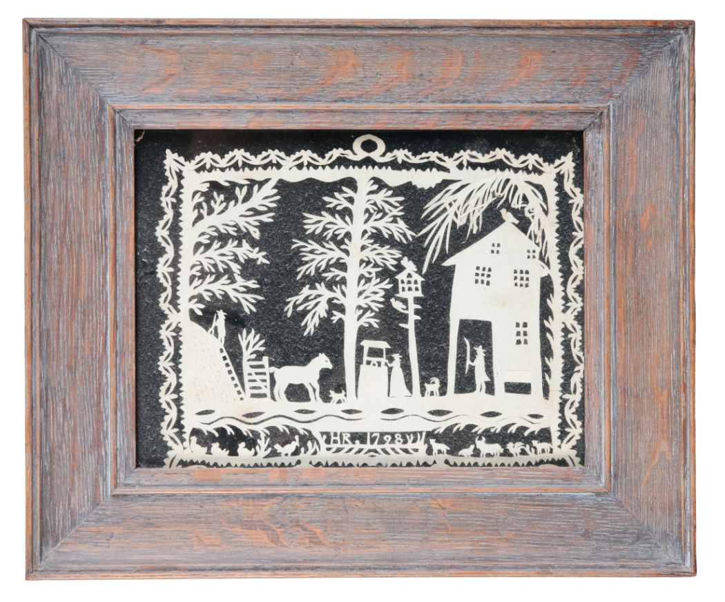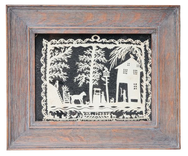 antique etching with artist's hand colouring, 7.5cm x 5cm; together with a cut out farmstead scene, 15cm x 20cm (2)