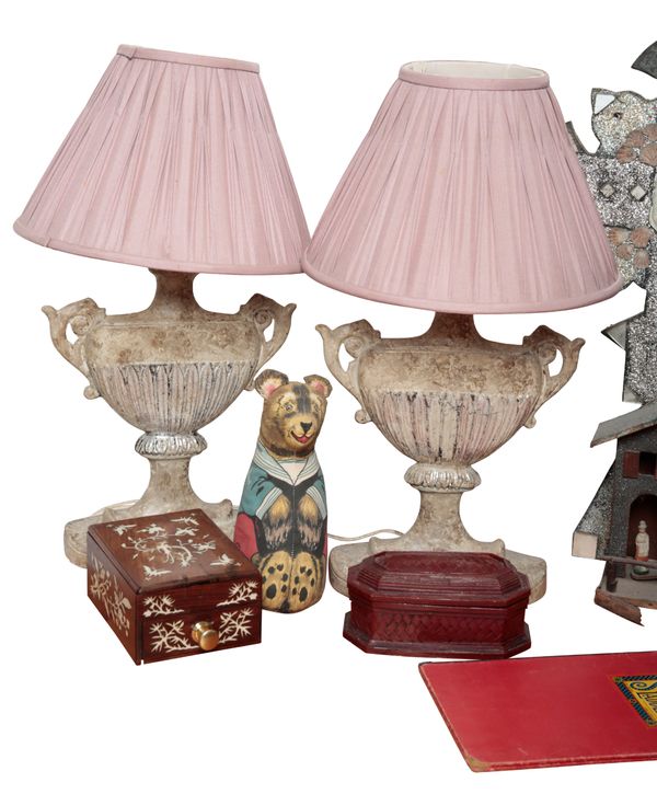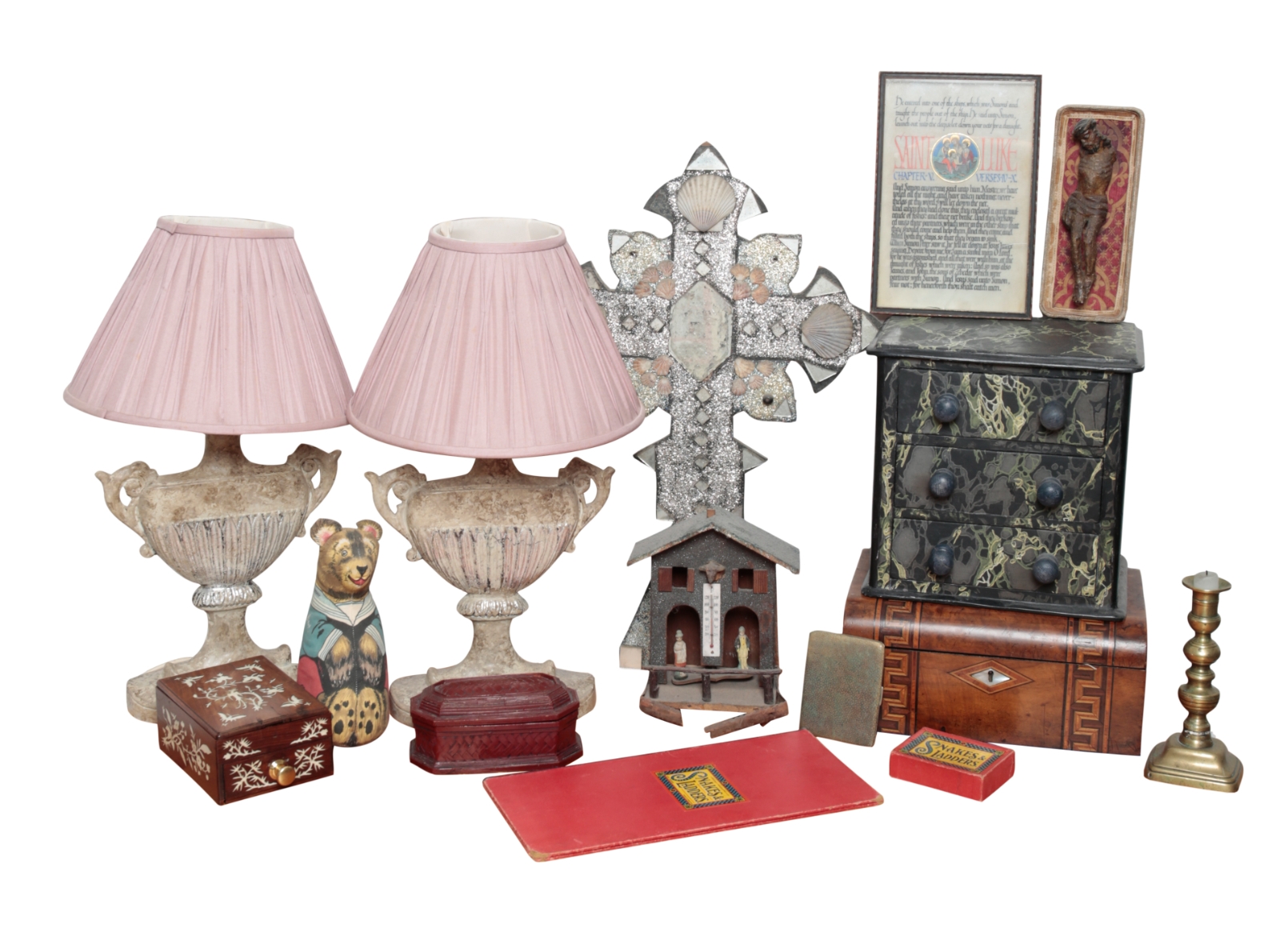 20th century, decorated with shells, glitter and mirrored panels, 60cm high x 40cm wide, a hand-written label verso 'Bishop Cross Church in Norfolk, England'; together with a framed calligraphy velum panel 'St. Luke Chapter V Verses IV-X'; a pair of composition urn form electric table lamps with shades, each 54cm high; a 19th century three drawer chest (from a dressing table), later decorated in black, gold and green faux marbling,