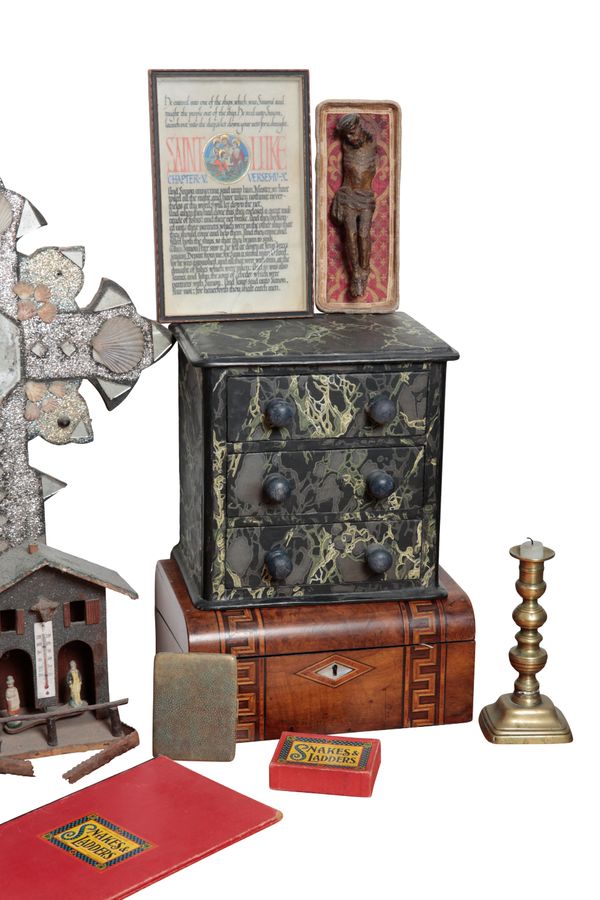 27cm high x 28cm wide x 21cm deep; a shagreen effect cigarette case; an old gesso and carved wood figure of Christ crucified; a vintage 'snakes and ladders' board game; an early 20th century German hygrometer; an 18th century brass ejector candlestick; a Victorian parquetry inlaid walnut work box; and a Deans Rag Knockabout Teddy toy, 24cm high (a lot)