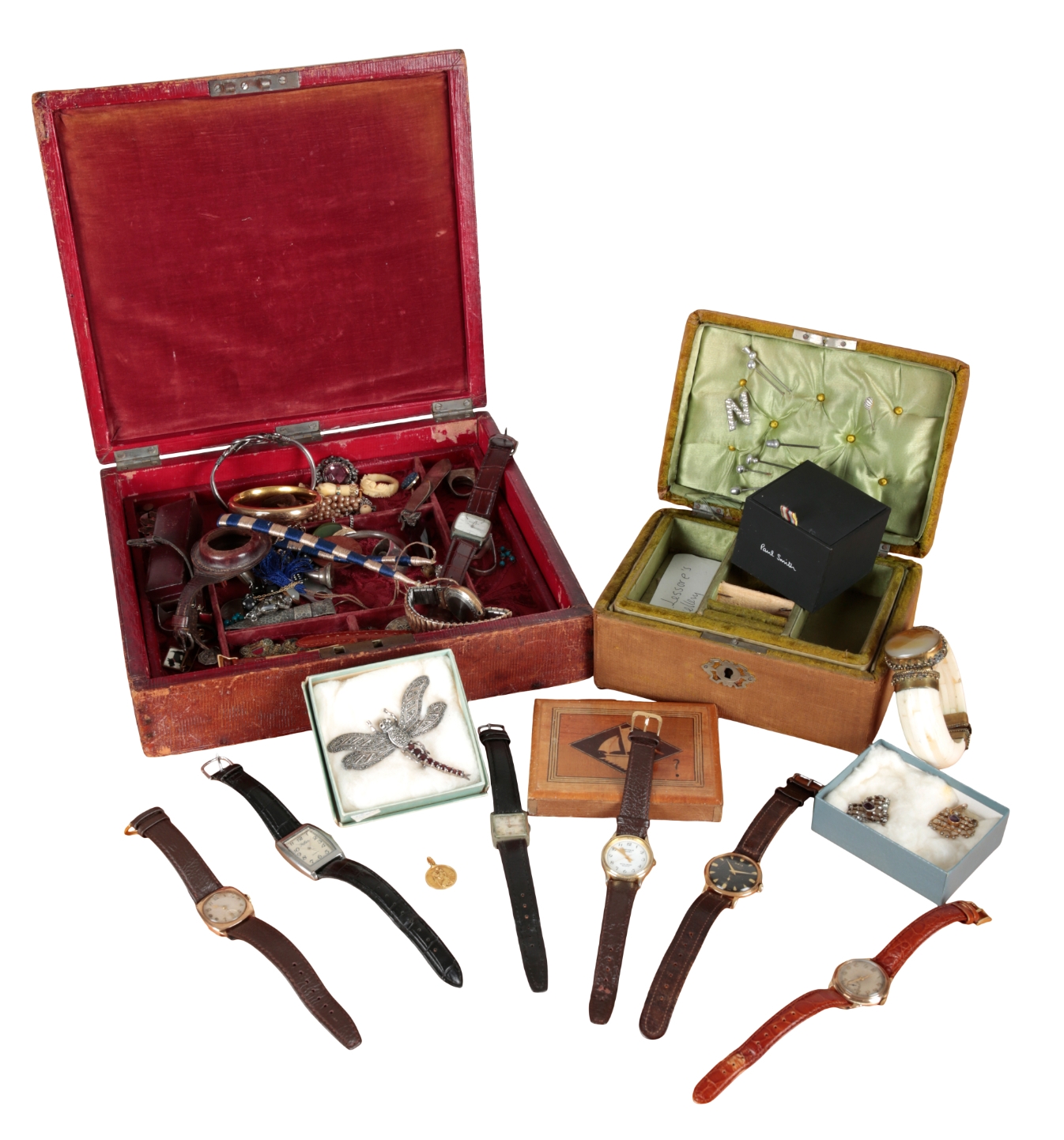 early 20th century, the champagne dial with gilt Arabic numerals, 32mm diameter, with later leather strap; together with a similar watch in a square case, 30mm diameter, with brown leather strap; a gold-coloured metal St. Christopher circular pendant; a gold-coloured metal jadeite tigers claw style pendant; a quantity of decorative costume jewellery and watches, contained in a 19th century red leather covered case; and an Edwardian green velvet-coloured jewellery box (a lot)