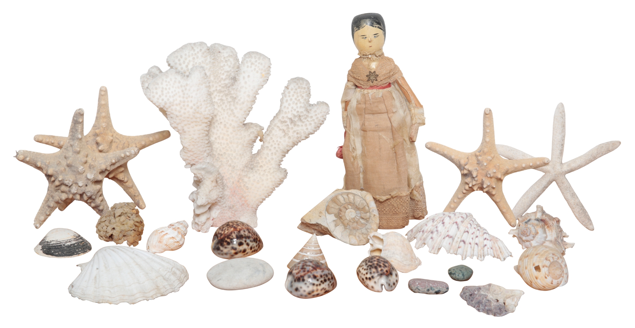 8cm high x 10cm wide; a collection of sea shells and other items; and an early 19th century peg doll wearing original clothes, all contained in a brown Morocco leather covered box, retailed by Mappin & Webb (a lot)