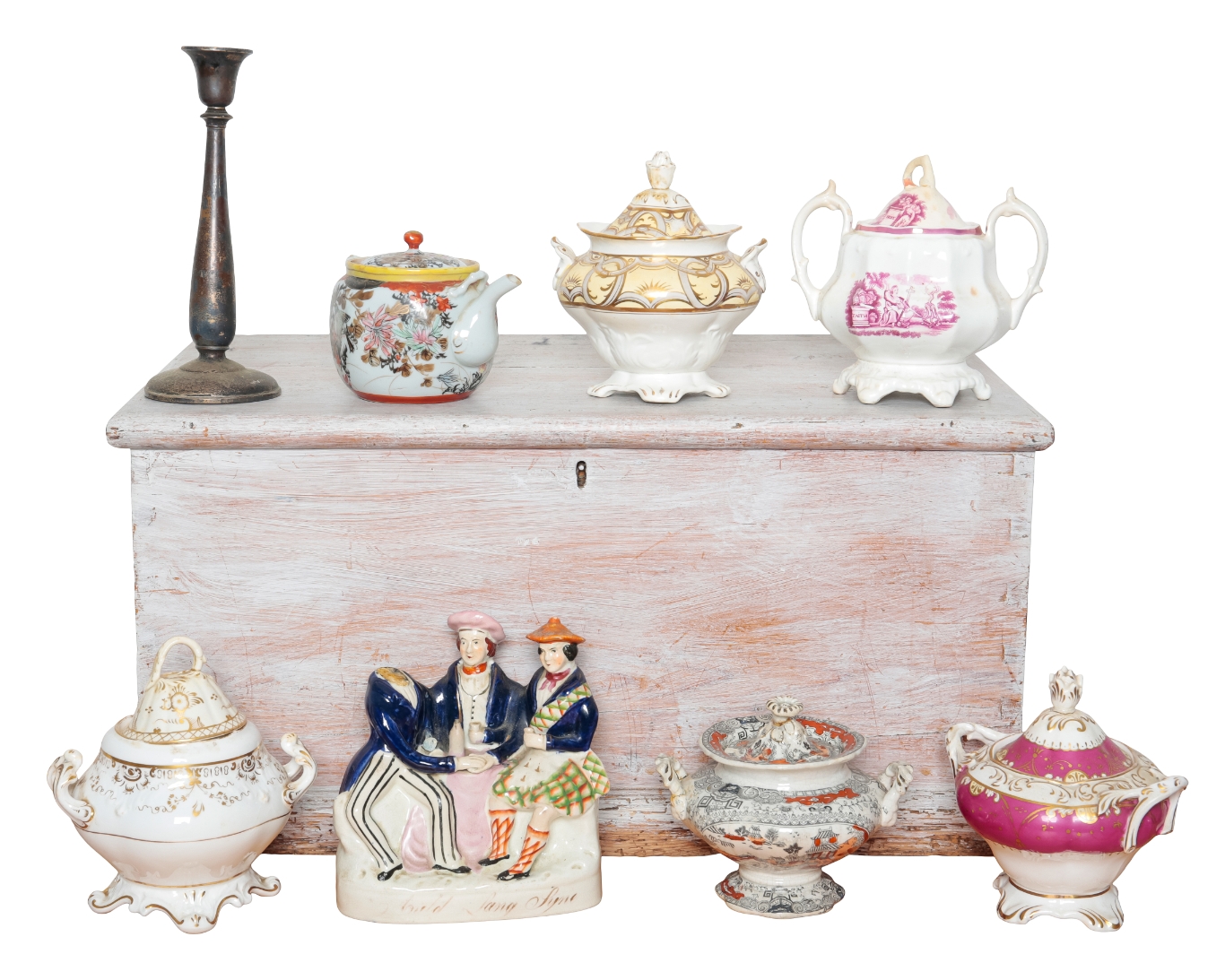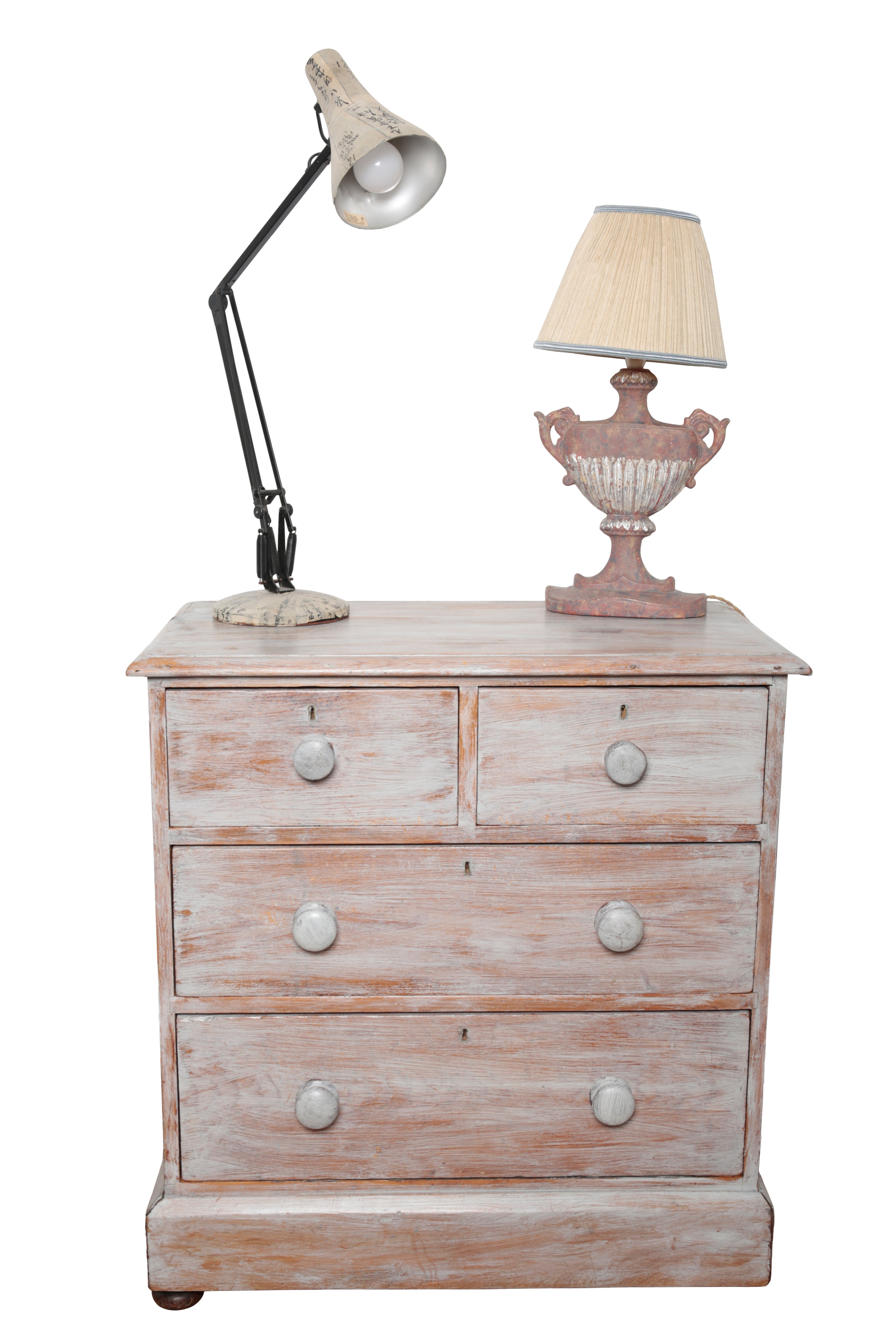the shade and base later papered in Chinese calligraphy rice paper, 67cm high; together with a lacquered lidded box of shaped outline, similarly decorated, 4.5cm high x 24cm wide x 17cm deep; a composition marble effect urn form electric table lamp with shade, 55cm high; a scumbled pine chest of drawers fitted with two short and two long drawers, with plinth support, 85cm high x 80cm wide x 45cm deep; a similar pine trunk, 35cm high, enclosing an assortment of English ceramics (12)