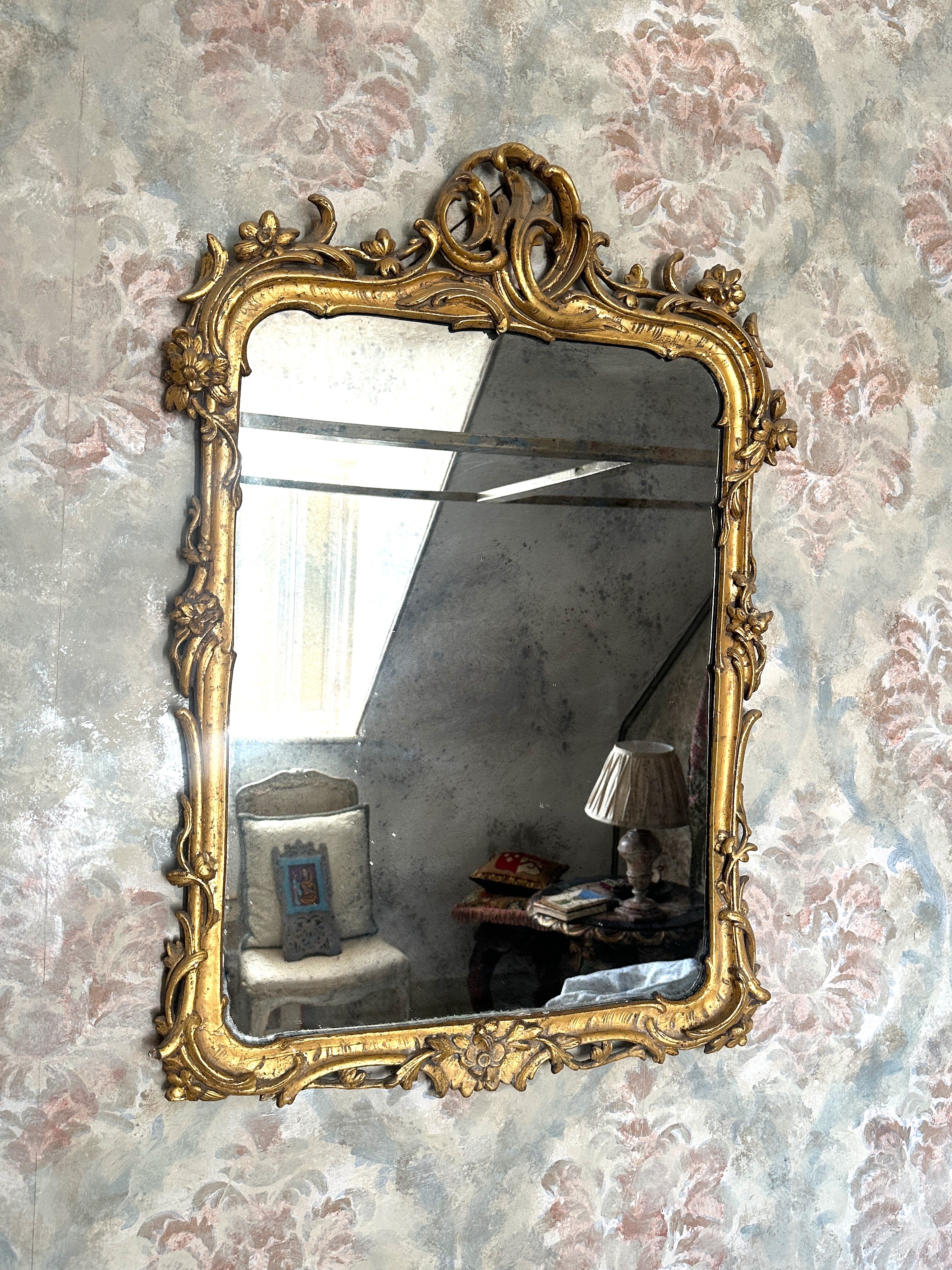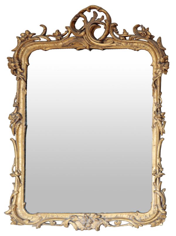 of rococo design, with scrolled leaf cresting and floral border, plain mirror plate, 84cm high x 58cm wide