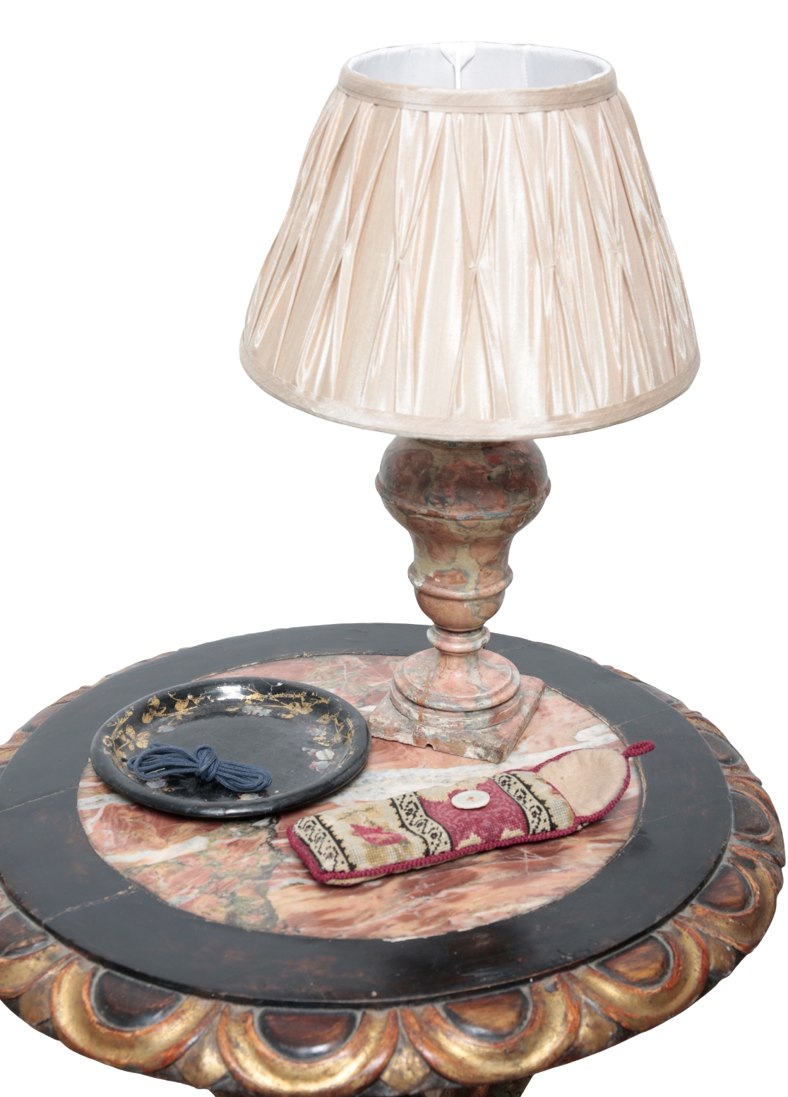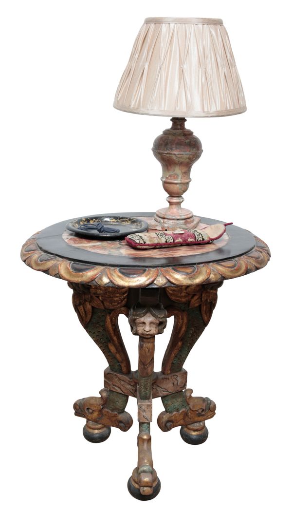 of Venetian baroque style, the top inset with red-veined marble slab, with ebonised and gilded lappet rim, on triple mermaid caryatid supports with dolphin toes, on flattened ball feet, 62cm high x 60cm diameter; together with a faux marble painted wood baluster-shaped electric table lamp, with shade, 49cm high; a papier-mâché circular tray; a needlework spectacle case;