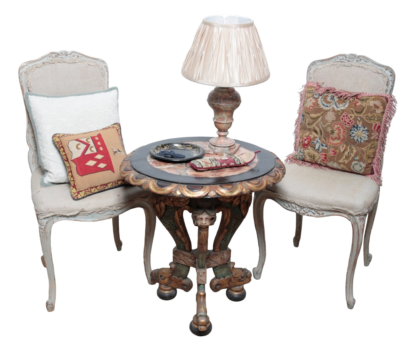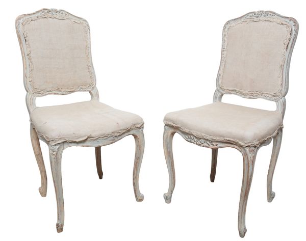 a pair of French painted beechwood bedroom chairs, the rectangular shaped backs carved with leaves, calico upholstered backs and seats on slender cabriole legs; and three decorative cushions (a lot)