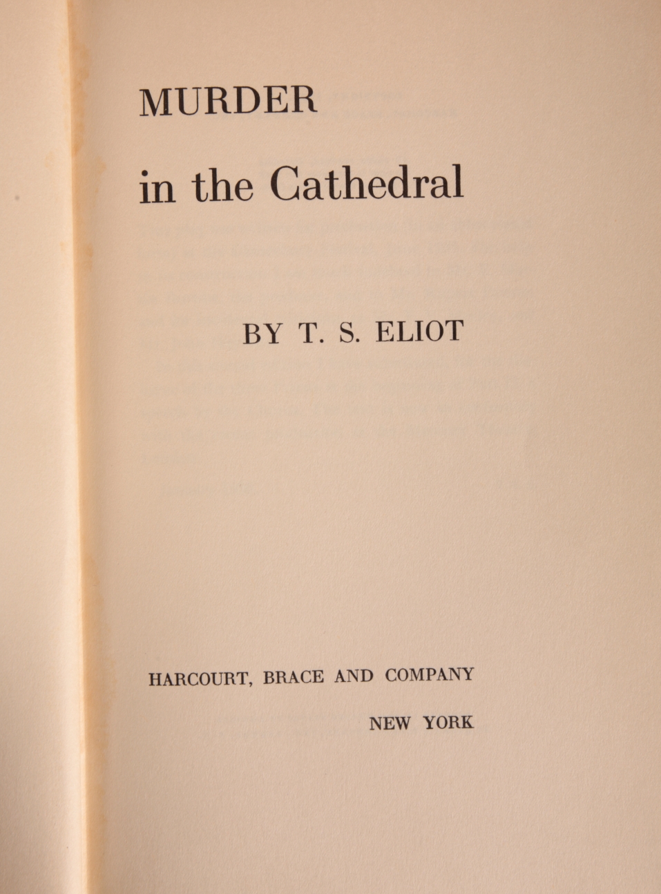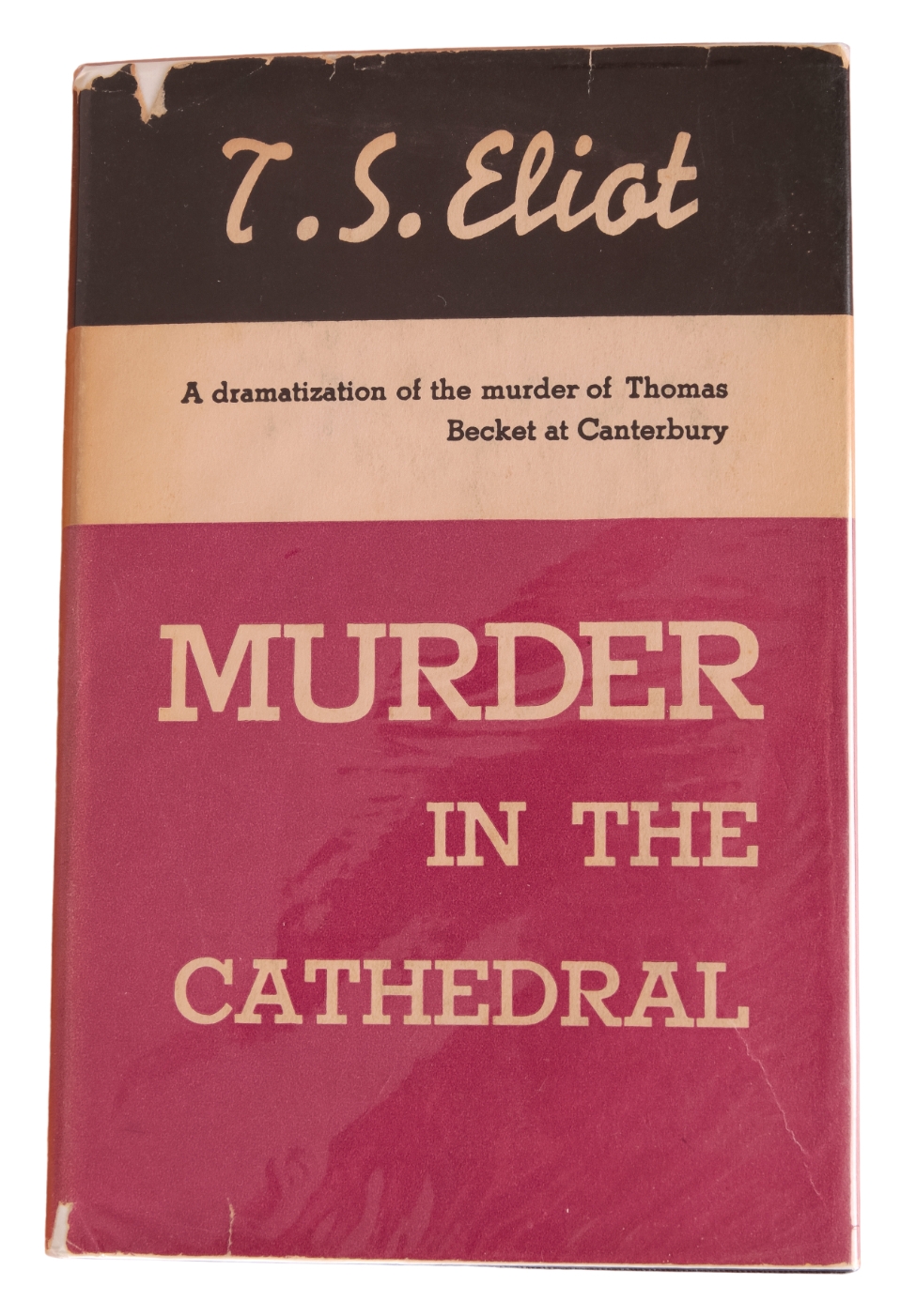 The dark blue binding is bumped to top and bottom of spine and the dustwrapper title ‘Murder in the Cathedral’ has transposed to the front cover.