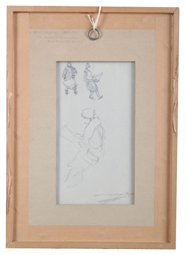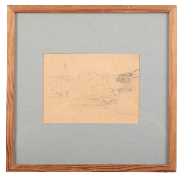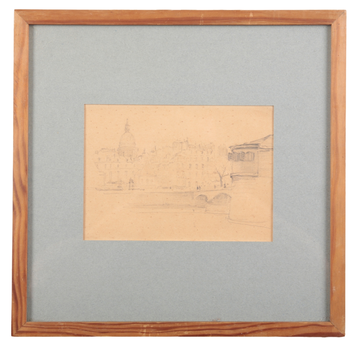 with figures studies verso, signed verso, pencil, 21cm x 11cm; together with another pencil study by the same hand depicting a Parisian cityscape, 12.5cm x 18cm (2)