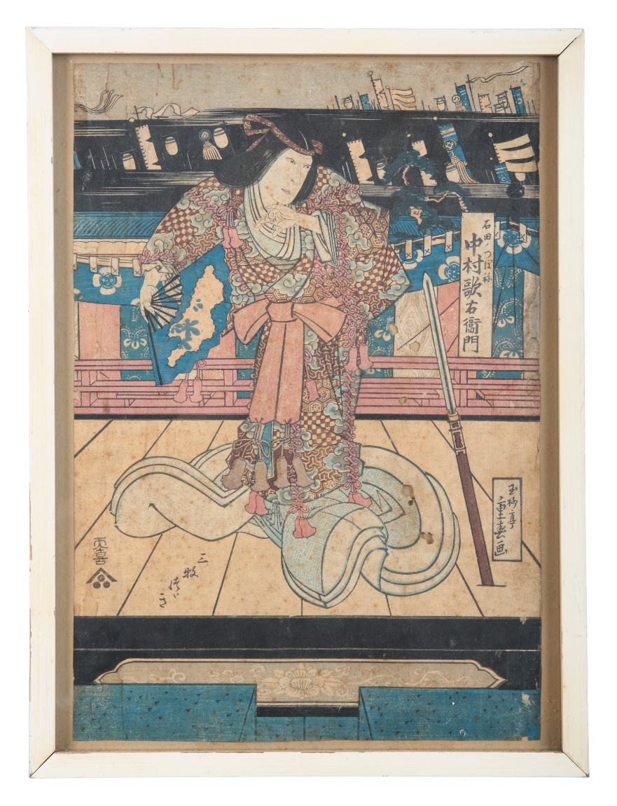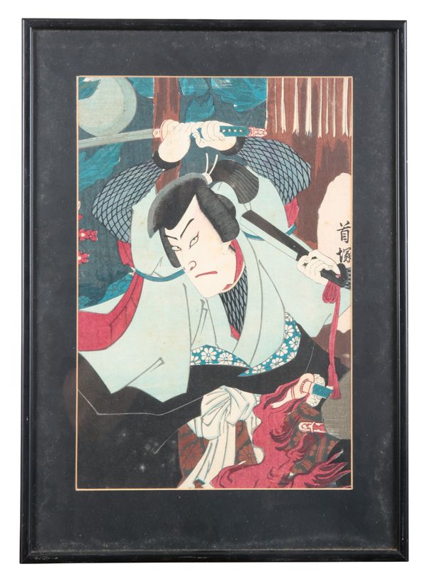 the Kabuki figure holds aloft a sword as a Geisha reclines under a parasol, woodblock print in colour, 34cm x 48cm; together with three similar woodblock prints (4)