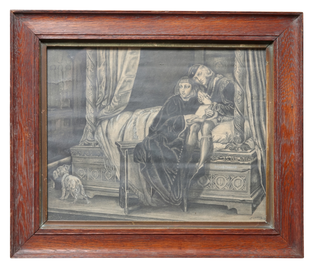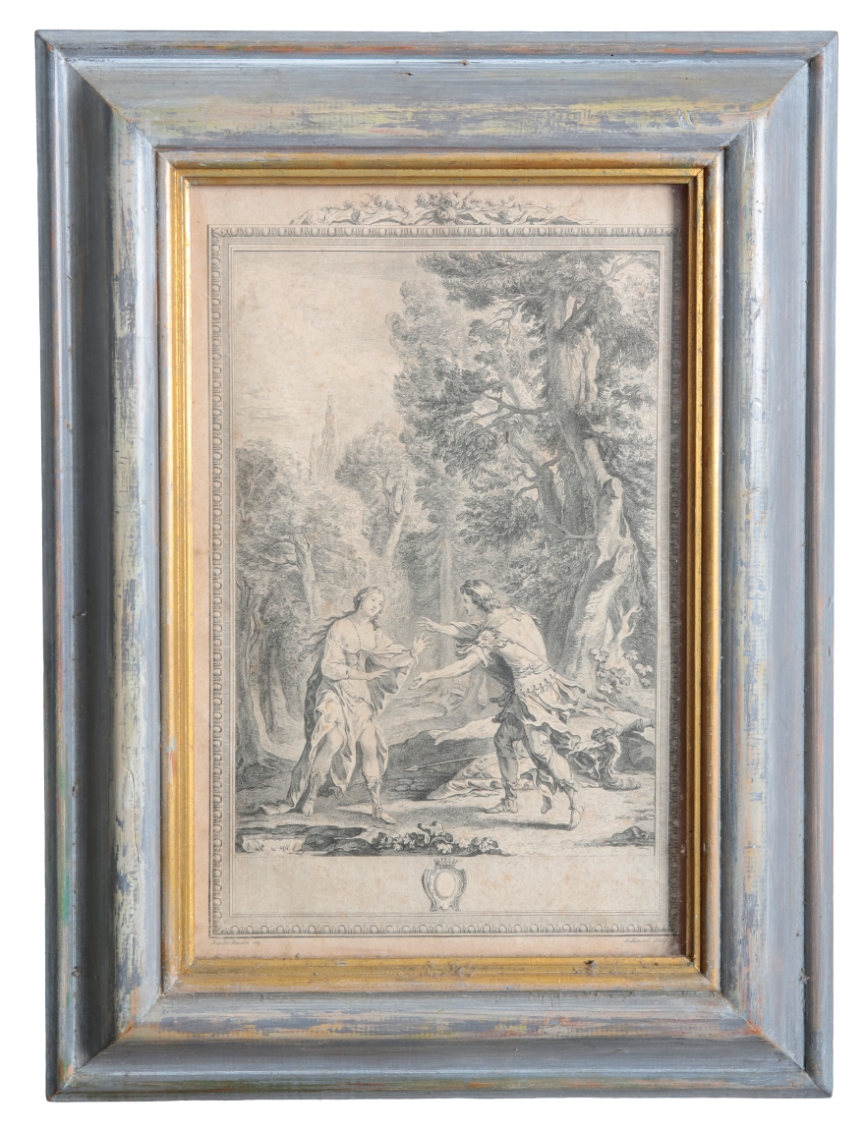 hand-embellished print, 29cm x 36cm; together with a second print depicting a courtship scene (2)