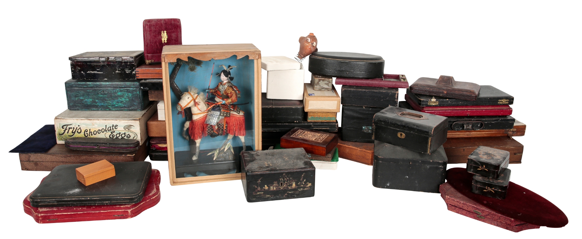 in glazed pine case, 39cm high x 27cm wide x 15cm deep; together with a Japanese black lacquered two division tea caddy; and a large collection of cutlery and other boxes (a lot)