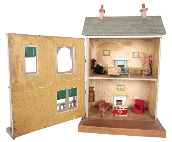 of Victorian style, with white-painted veranda, the front opening to reveal a two storey interior, 106cm high x 49cm wide x 35cm deep, containing mixed furniture (a lot)