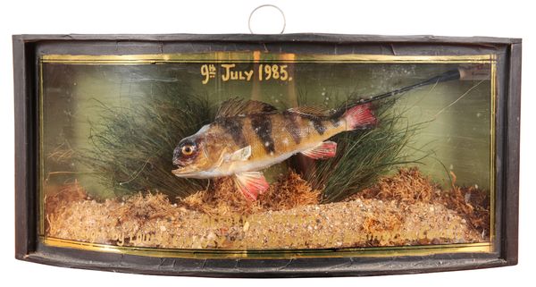 within an ebonised bowfront display case, '9th July 1985... Deformed Perch, Caught by Louise Lindsay, aged 5, Wyrley-Essington Canal', Barry Williams taxidermist label verso, 16cm high x 37cm wide x 11cm deep