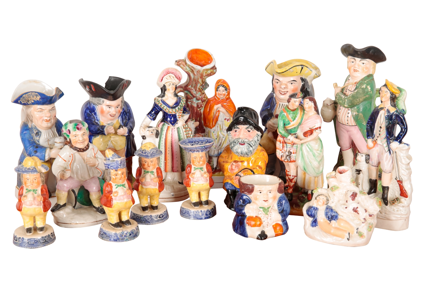 modelled with standing figures each holding a beer tankard, wearing red jacket, yellow trousers and within Willow pattern borders, comprising salt, pepper, mustard and vinegar, the tallest 14cm high; together with a 19th century pottery ‘Hearty Good Fellow’ character jug, modelled with standing figure wearing green jacket, 28cm high; a Samson porcelain Toby jug of Chelsea design, 21cm high; and ten other pottery figures (16)