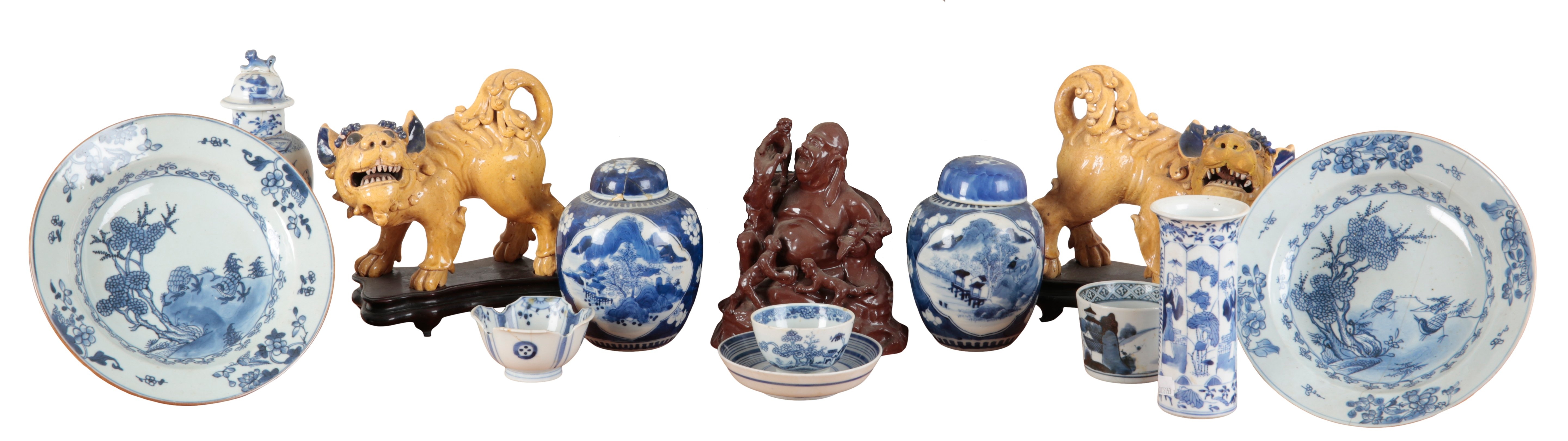 20th century, modelled on all fours atop a carved wood base, 22cm high x 20cm long x 13cm wide; together with a quantity of blue and white Chinese porcelain, including two vases bearing Kangxi four character marks to the base, two lidded ginger jars with rural Chinese landscapes enclosed within cartouches on a blue ground, and various other similar examples (a lot)