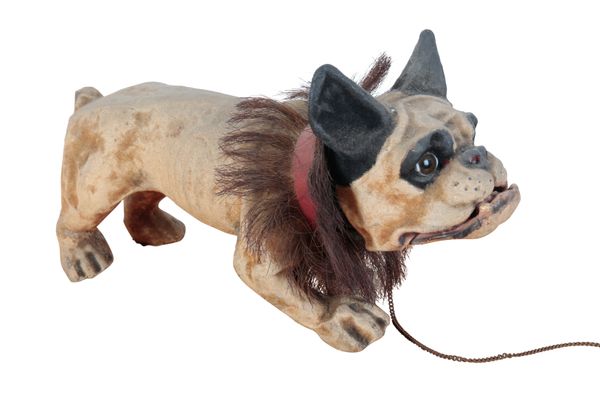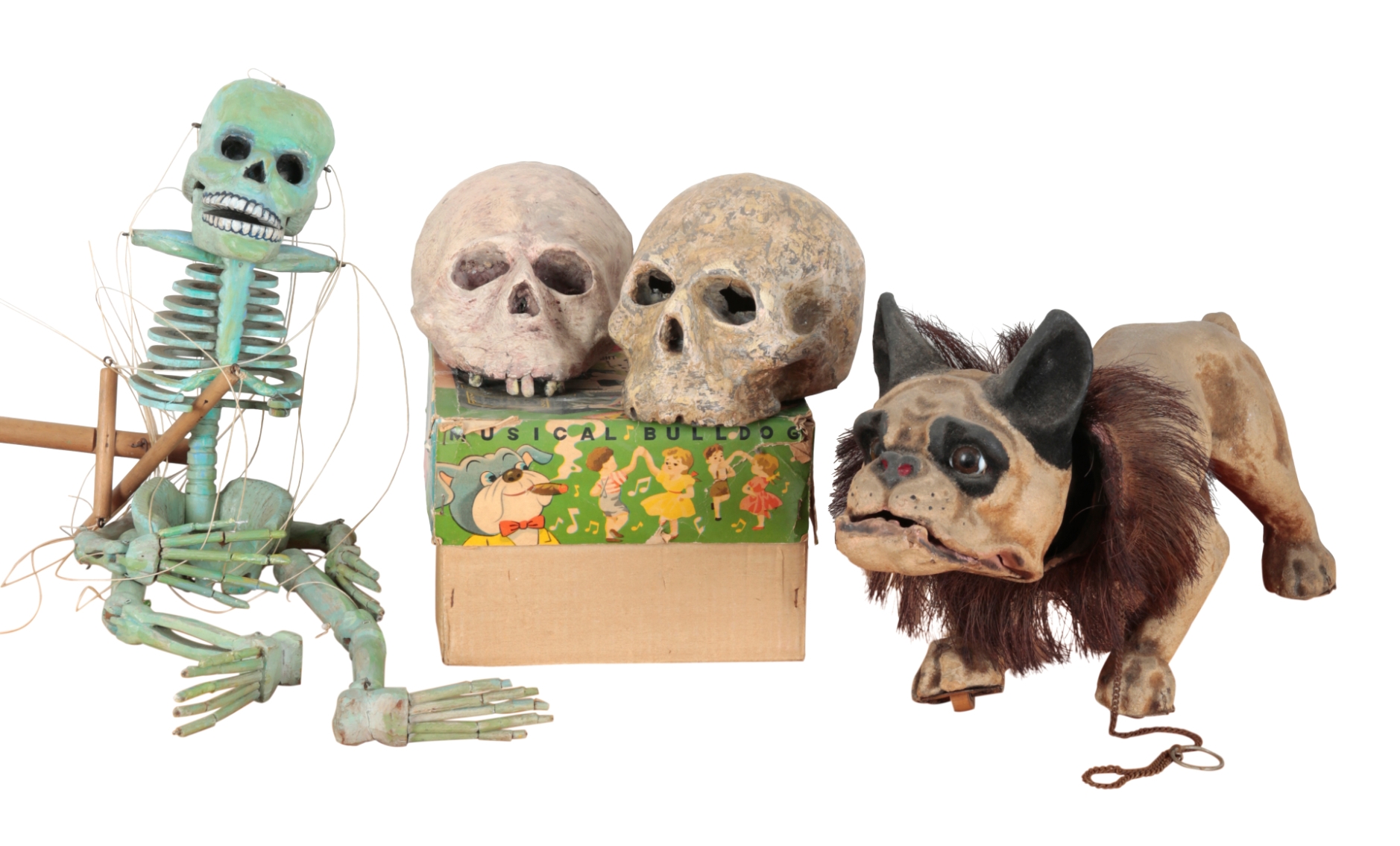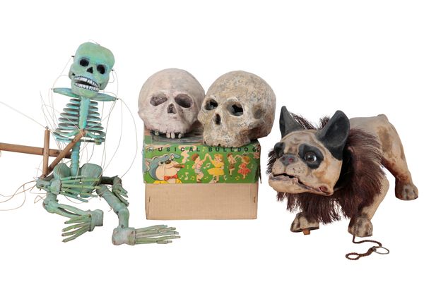 late 19th century, the dog with nodding head and articulated jaw activated by a chain-link pull cord originating from the red painted collar, on turned wooden castors, 27cm high x 45cm long x 20cm wide; together with two papier-mâché skulls; a carved wood skeleton marionette; and a 'musical bulldog' (5)