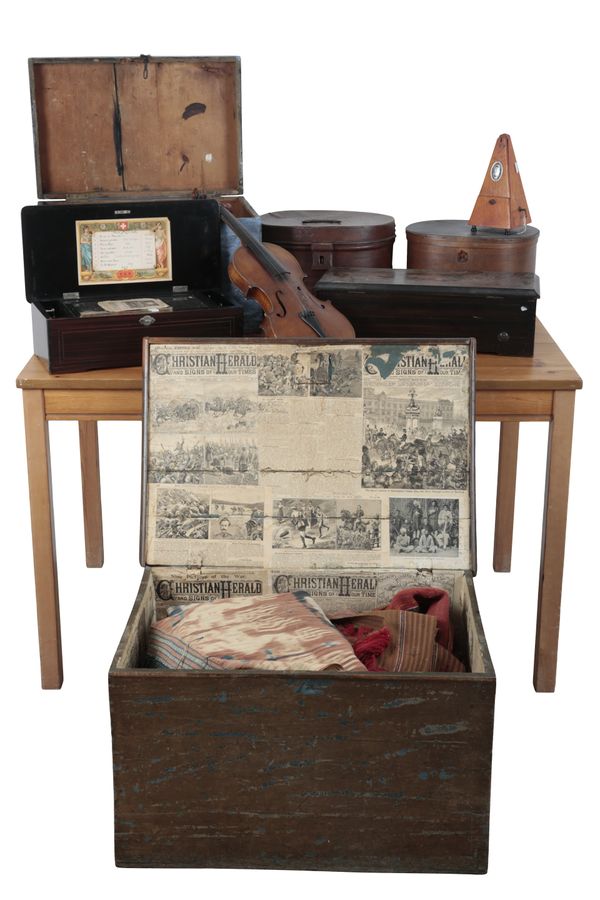19th century, the barrel movements encased within inlaid and boxwood strung cases, the largest measuring 14cm high x 50cm wide x 22cm deep; together with a violin; metronome by 'system maelzel'; and several trunks and hat boxes containing various textiles and fabrics (a lot)