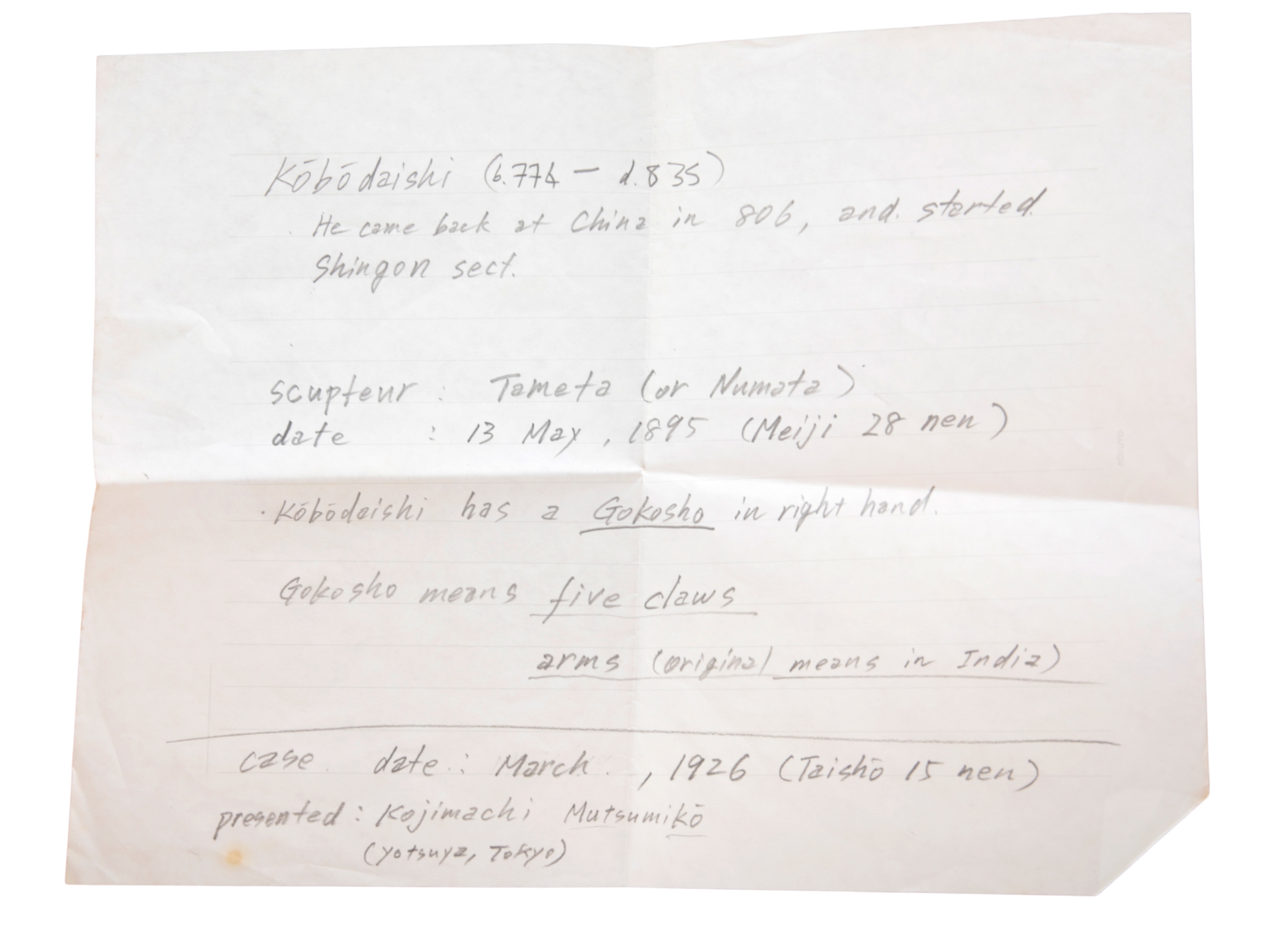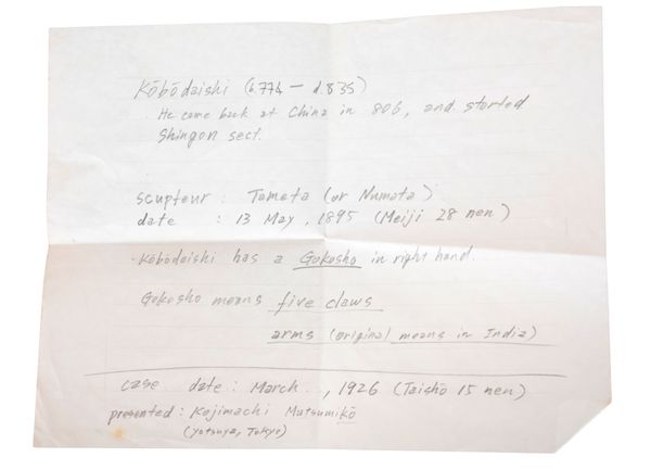 a Meiji period carved wooden figure of Kōbō Daishi sitting within the gilt interior of a black lacquered cabinet, red script to the flanks and verso, 32cm high x 24cm wide x 19cm deep
