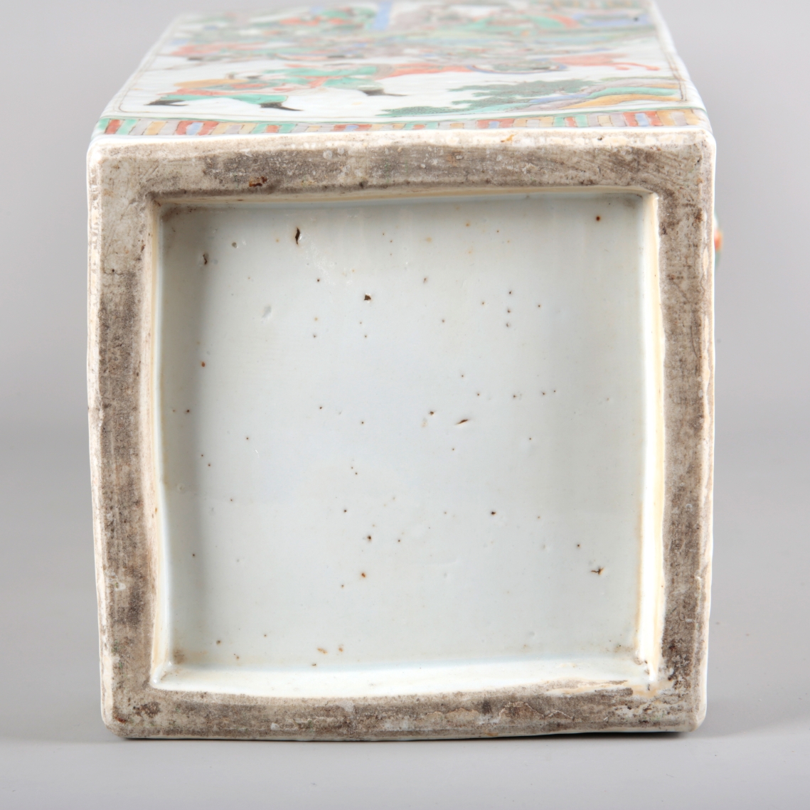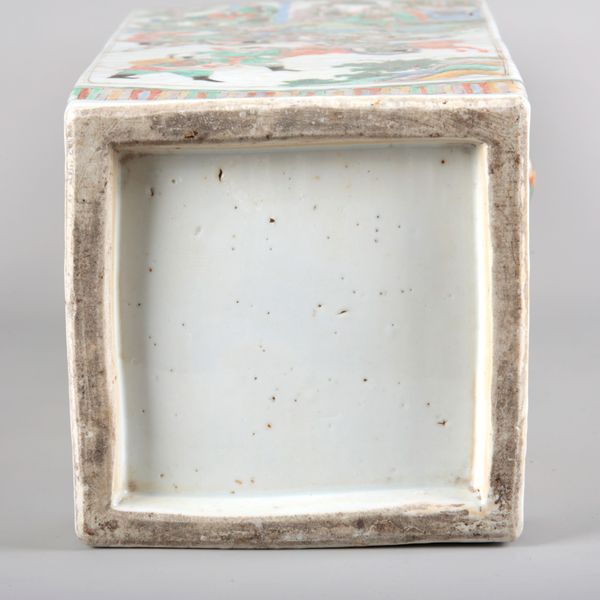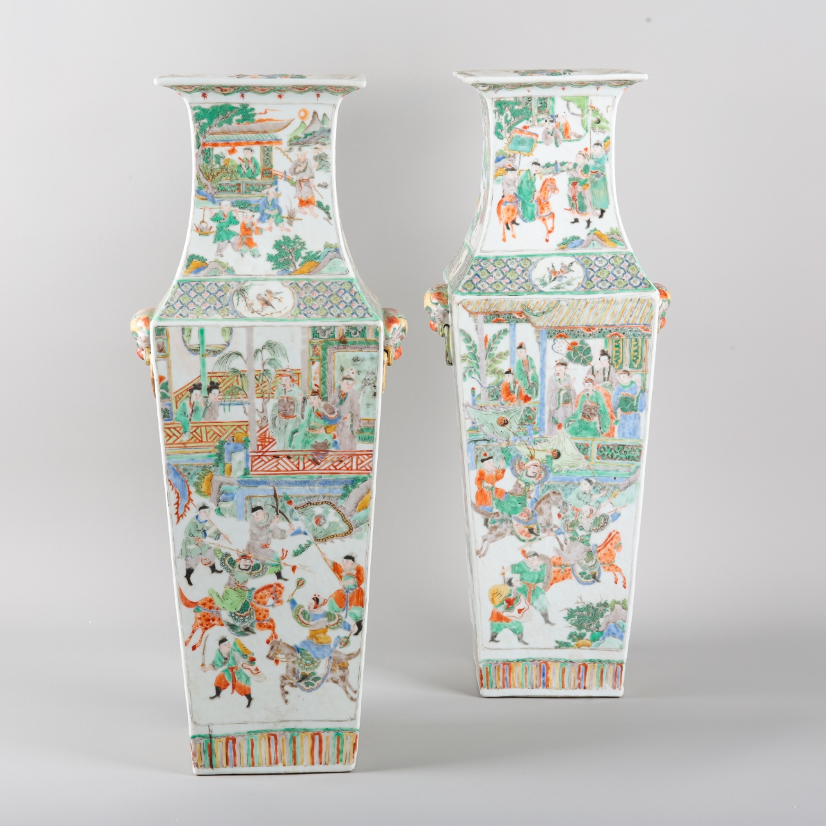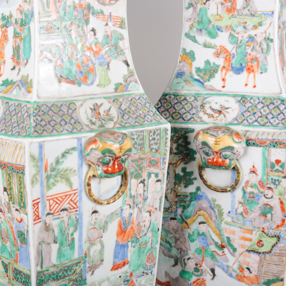 This pair of Chinese porcelain vases is in overall good condition, with both pieces remaining structurally sound and retaining their decorative appeal. Small chips are present on the upper corners of the rims on each vase, and there is some fading visible in the finer details of the enamel decoration. Crazing and flaking are evident throughout the design but remain largely stable and do not significantly detract from the visual interest of the pair. The interiors show signs of prior practical use as vases, with light surface residue and discoloration visible. Typical wear is noted to the unglazed footrims consistent with age and handling.
