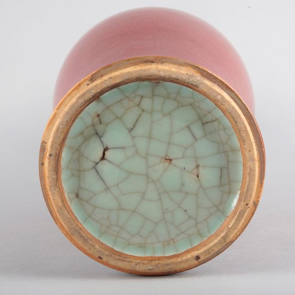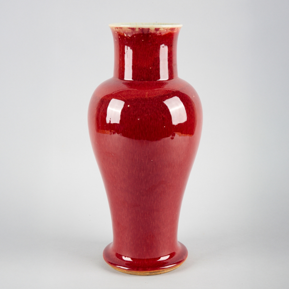 18th/19th century, with an everted rim, tapered body and outstepped foot, covered in a rich ox blood red glaze, 38cm high