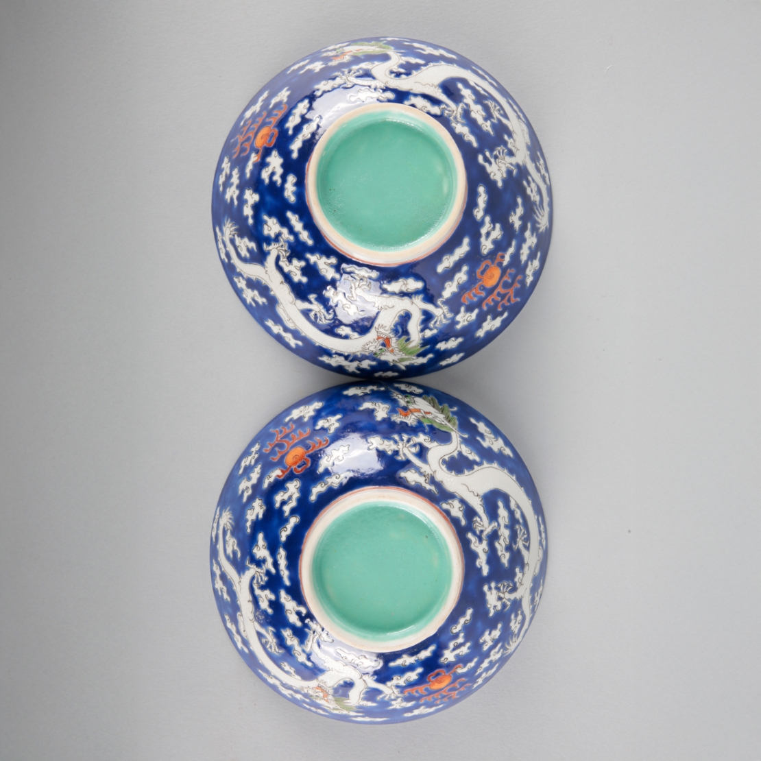 Both bowls appear in good condition overall, with some enamel wear visible, particularly at the center of the interior base of one bowl. Minor enamel firing faults and glazing impurities are present on both. Light scraping wear is visible on the exterior surfaces, but the bowls remain structurally sound and retain their overall visual appeal.