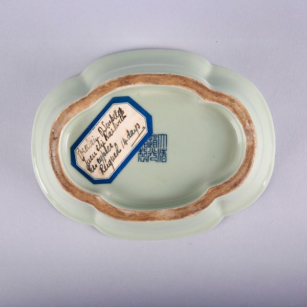 bearing a six character Daoguang seal mark to the base and probably of the period, with everted rim and moulded body, bearing an old collection label to the base, 8.5cm high x 21.5cm wide x 16.5cm deep