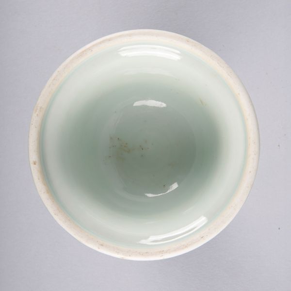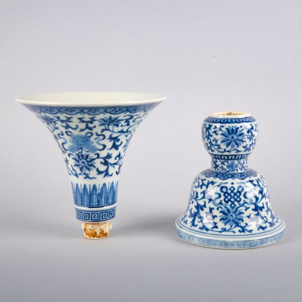 bearing a six character Jiaqing seal mark to the shoulder, in two pieces, with a flared neck and domed base, decorated with the eight Buddhistic emblems against a ground of lotus flowers and leafy tendrils, 25cm high x 14cm diameter