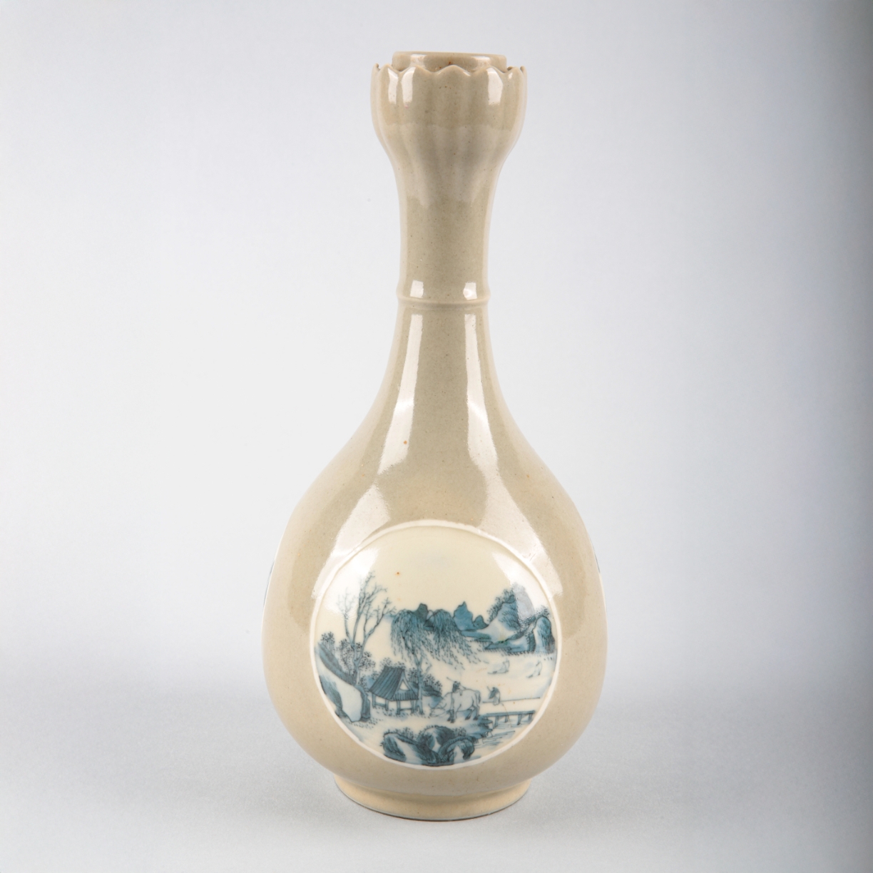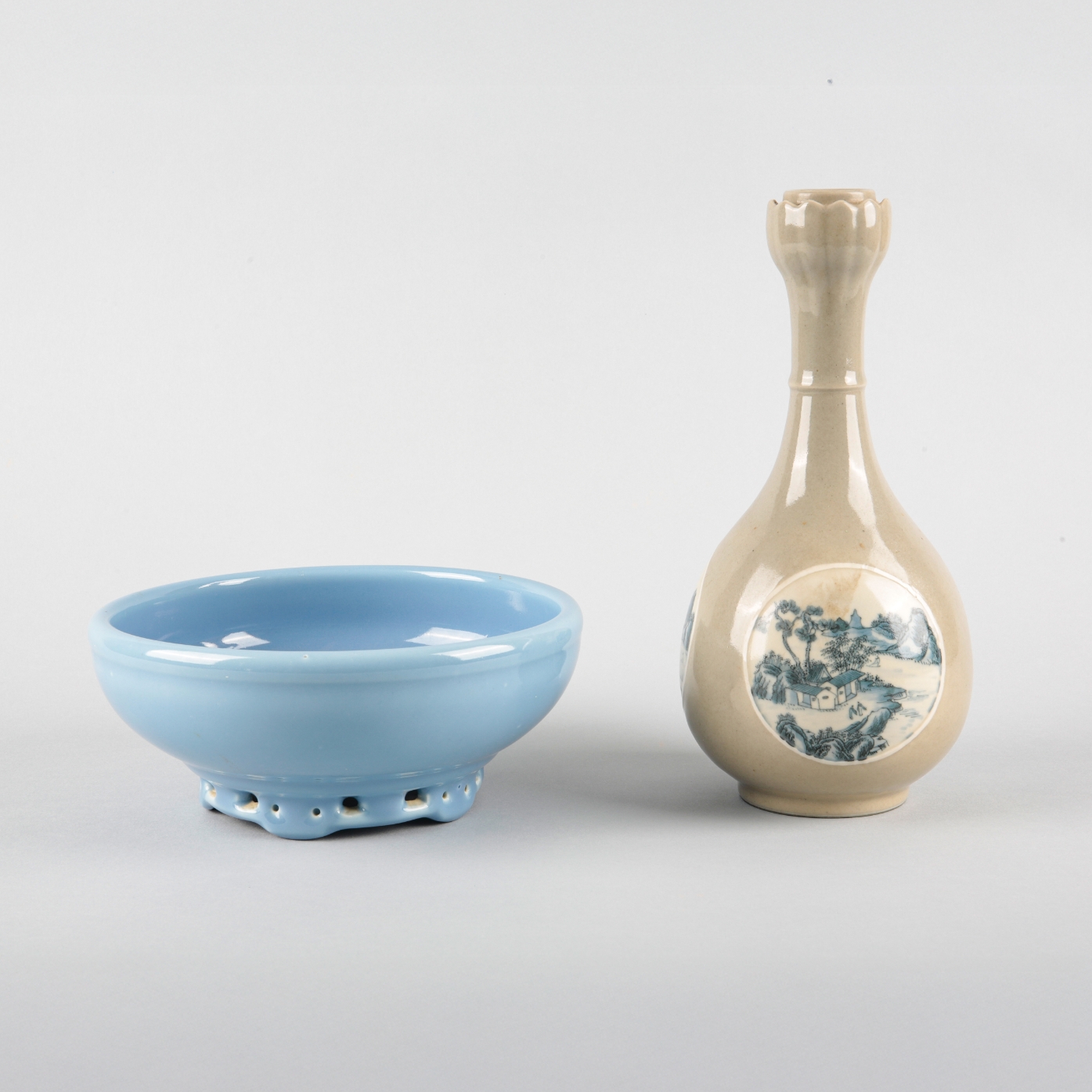 bearing a six character Qianlong seal mark to the base, 20th century, with moulded rim and pierced foot, 9.5cm high x 22cm diameter; together with a Chinese porcelain grey-painted bottle vase, similarly bearing a six character Qianlong seal mark to the base, 20th century, with petal form rim and decorated with blue and white landscape panels, 28cm high (2)