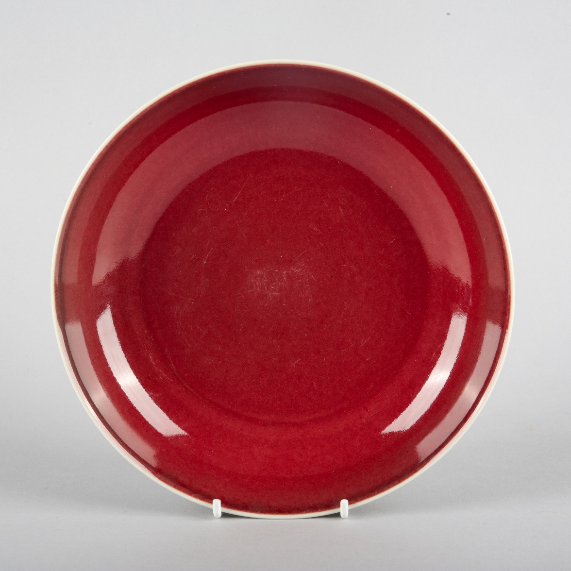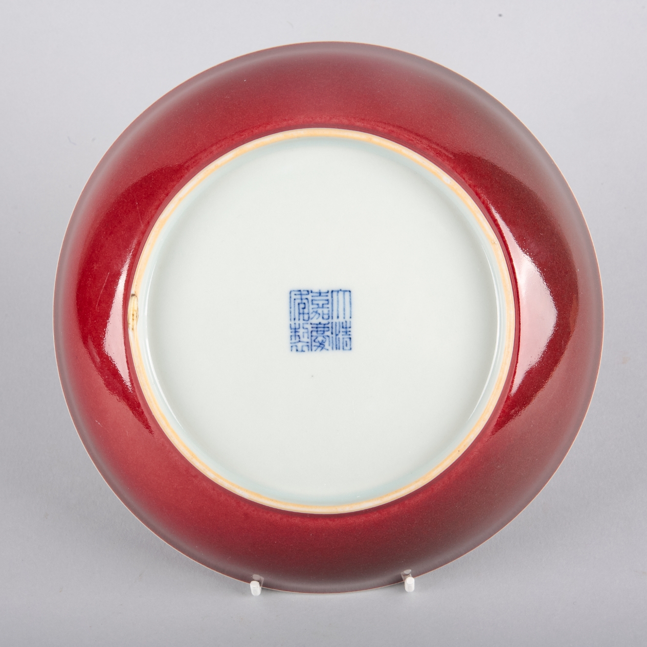 bearing a six character Jiaqing mark to the base, the shallow bowl with an everted rim and raised foot, 4.5cm high x 20cm diameter