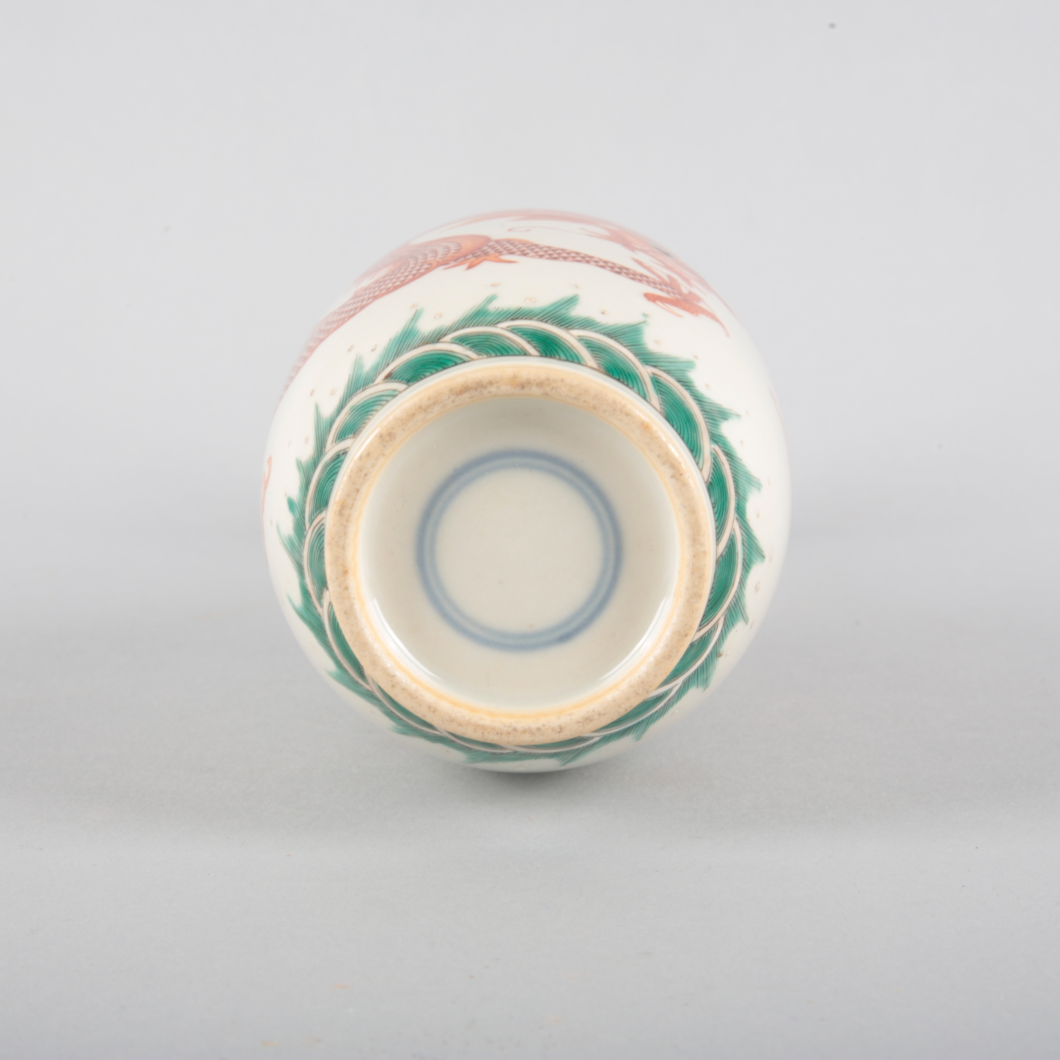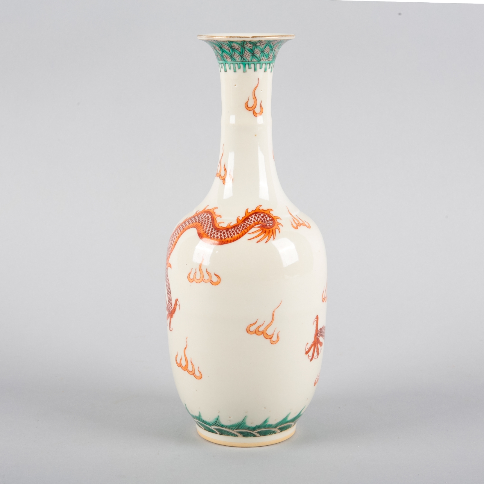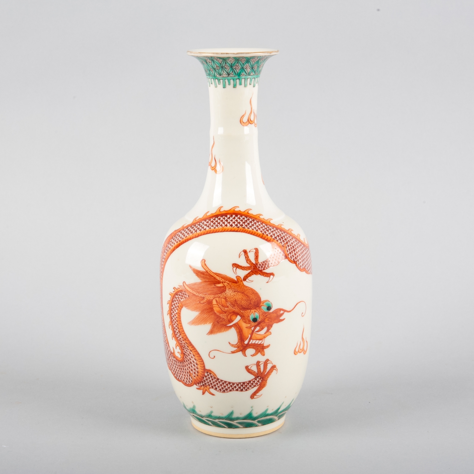 bearing a double concentric ring to the base, with a slender moulded neck and everted gilt rim, decorated with a dragon in flight, bands of green enamelled borders to the rim and foot, 22cm high