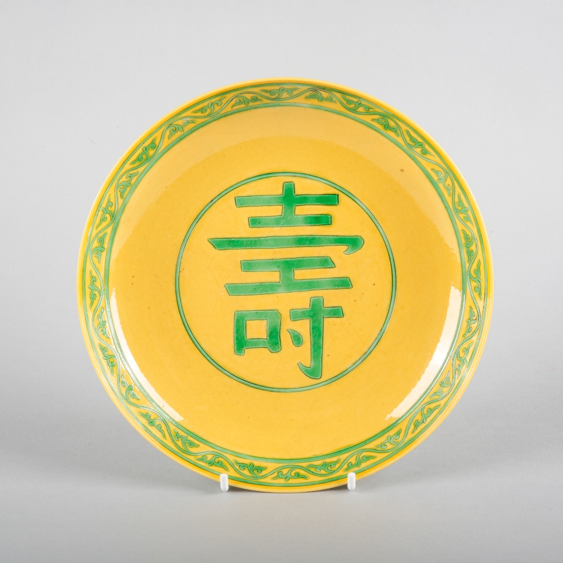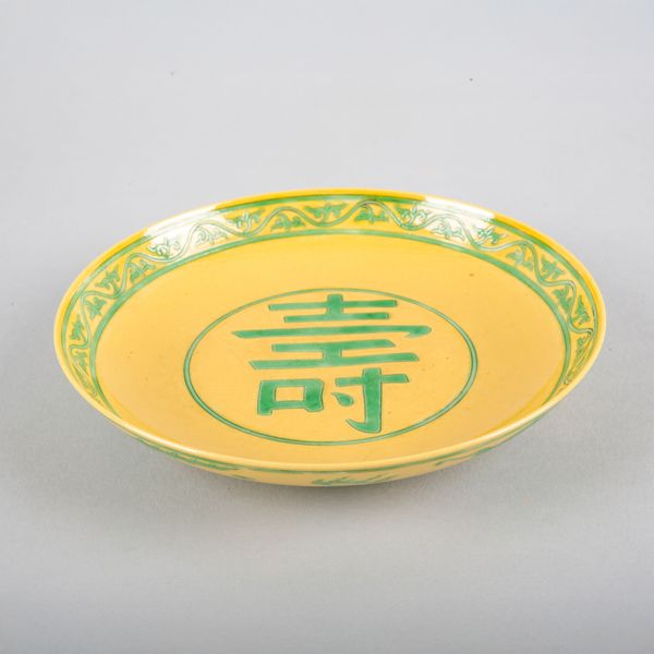 A CHINESE PORCELAIN YELLOW GROUND 'LONGEVITY' DISH