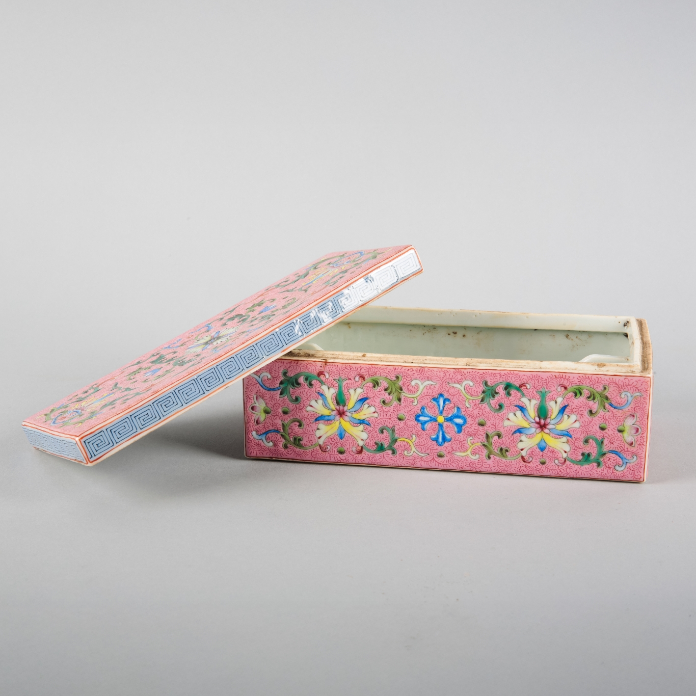 probably 20th century, the pink ground decorated with stylised flowers and sgraffito fronds, the interior divided into two compartments, 7cm high x 19cm wide x 9.5cm deep