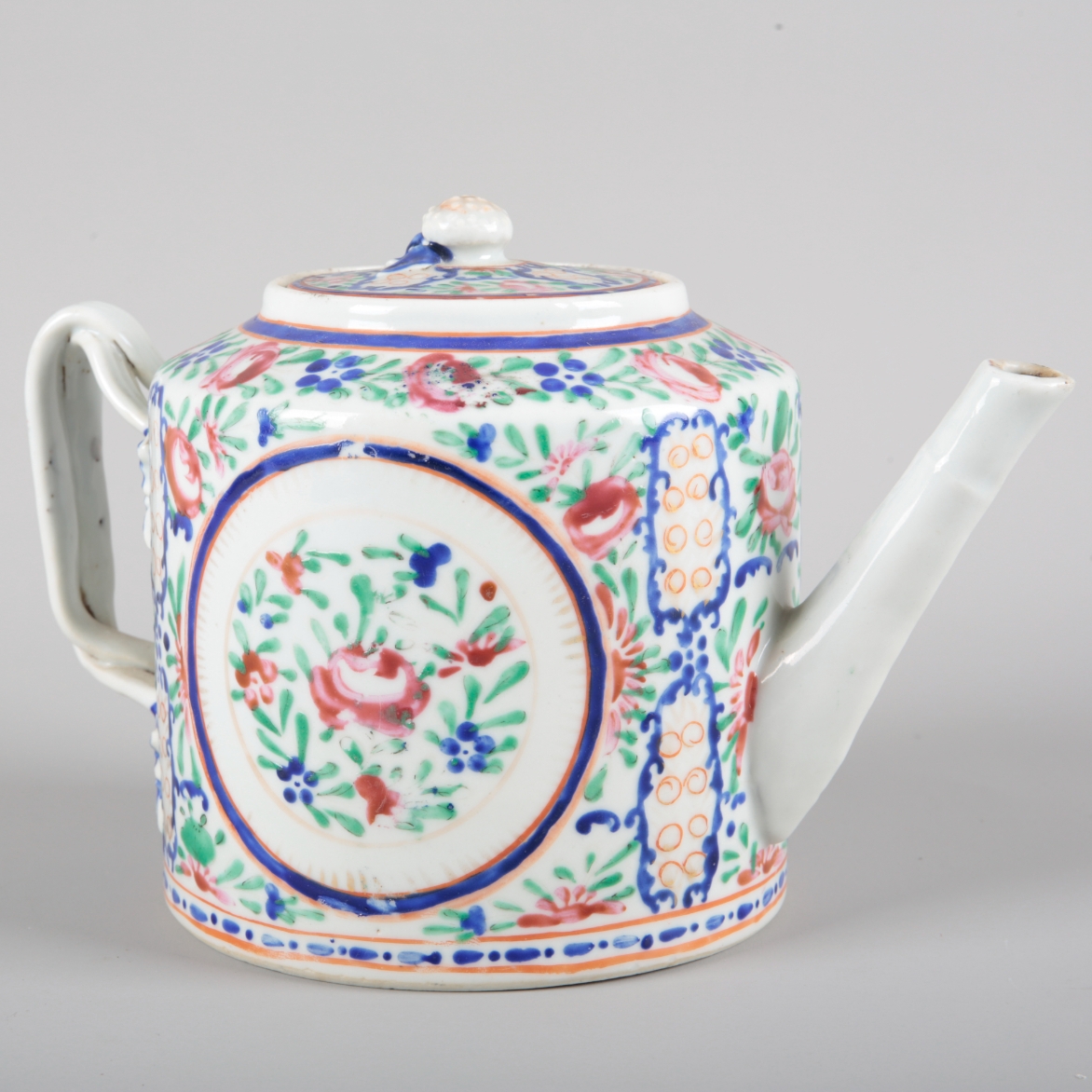 including an 18th century famille rose teapot and cover, 14cm high; a blue and white moon flask, bearing a four character Kangxi mark to the base, 21cm high; a small baluster vase and cover, 17cm high; a sparrow beak jug, 11.5cm high; another, 10cm high; two export porcelain plates, 22cm and 22.5cm diameter, and a small blue and white box and cover, 8cm diameter (8)