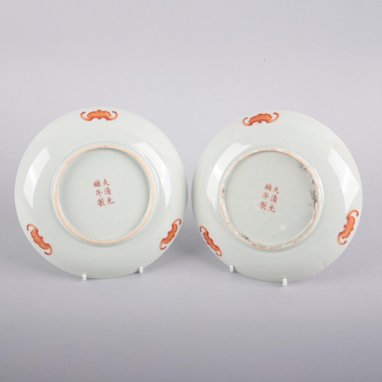 bearing six character Guangxu marks to the base and possibly of the period, decorated with plums and a husk of corn, 16.5cm diameter (2)