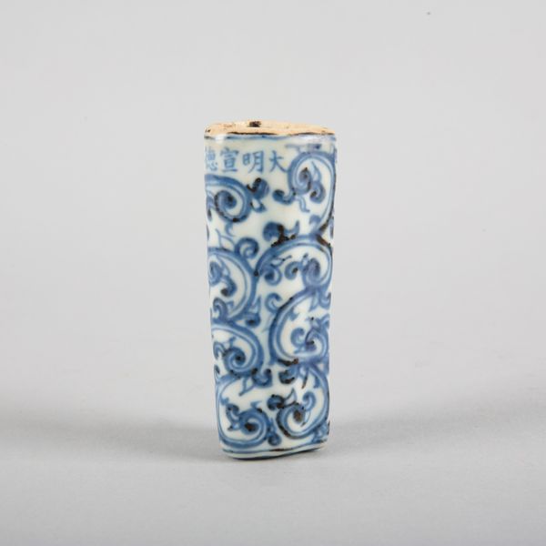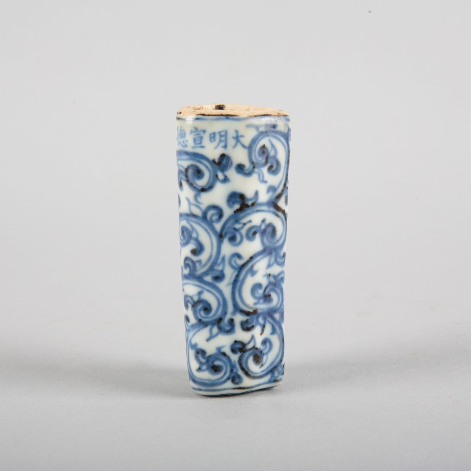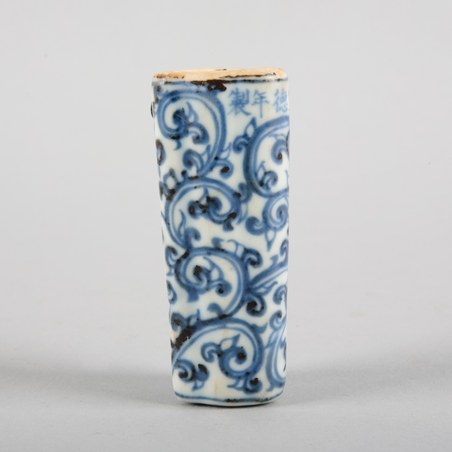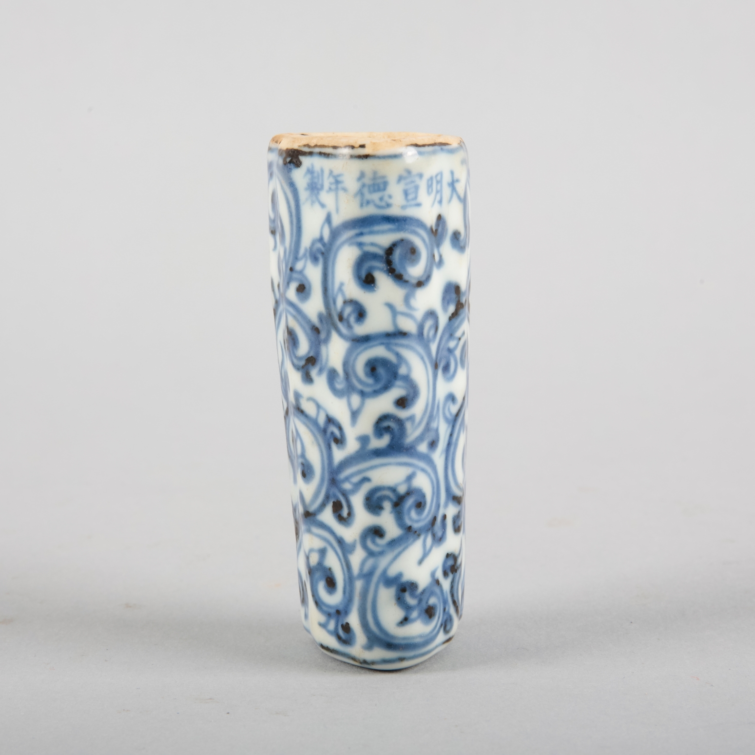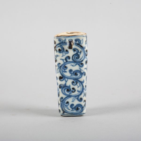 bearing a six character Xuande mark to top, moulded and tapered with a pierced loop to the back, decorated throughout with scrolling stylised foliage, 8.5cm high