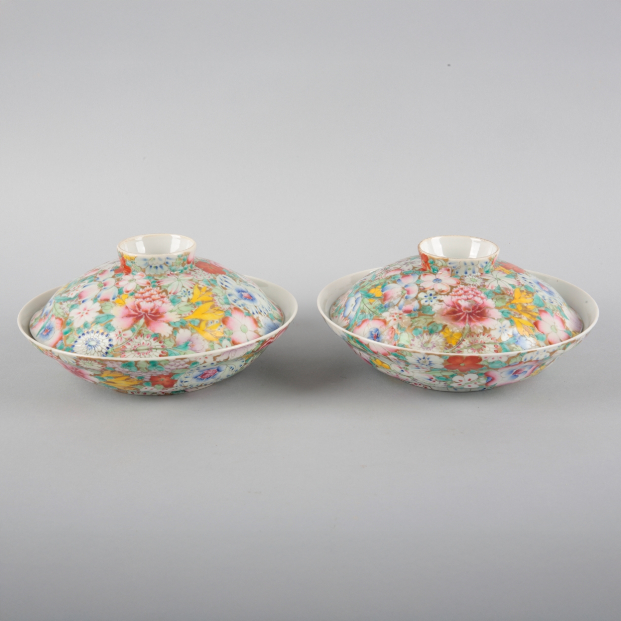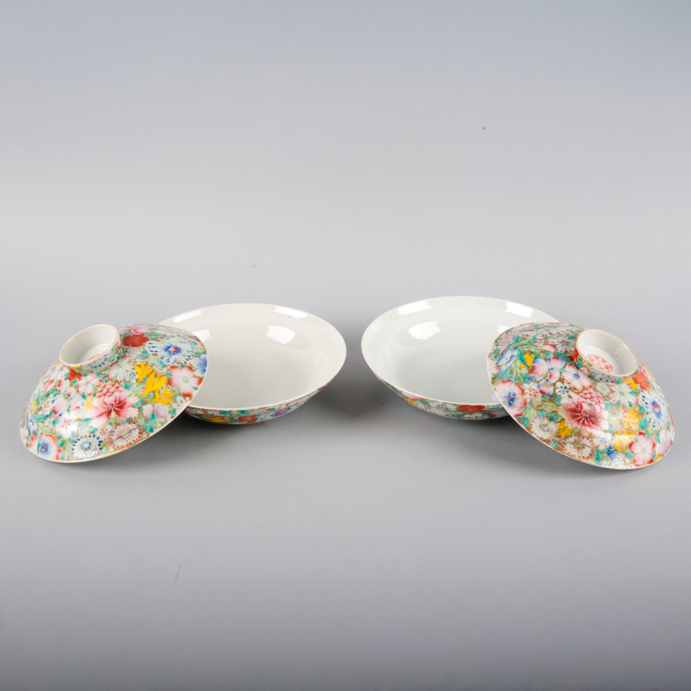 A PAIR OF CHINESE PORCELAIN MILLEFLEUR BOWLS AND COVERS