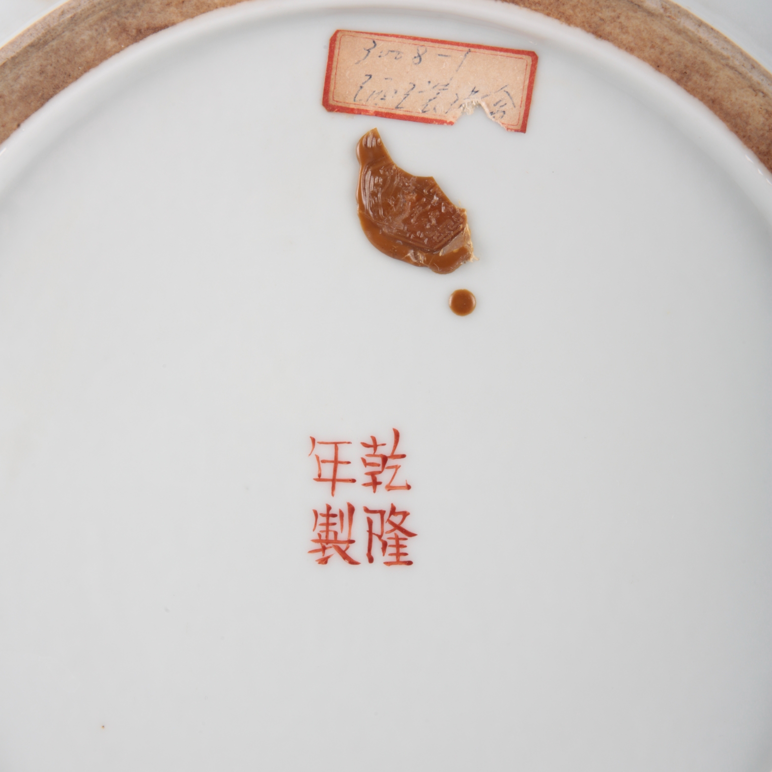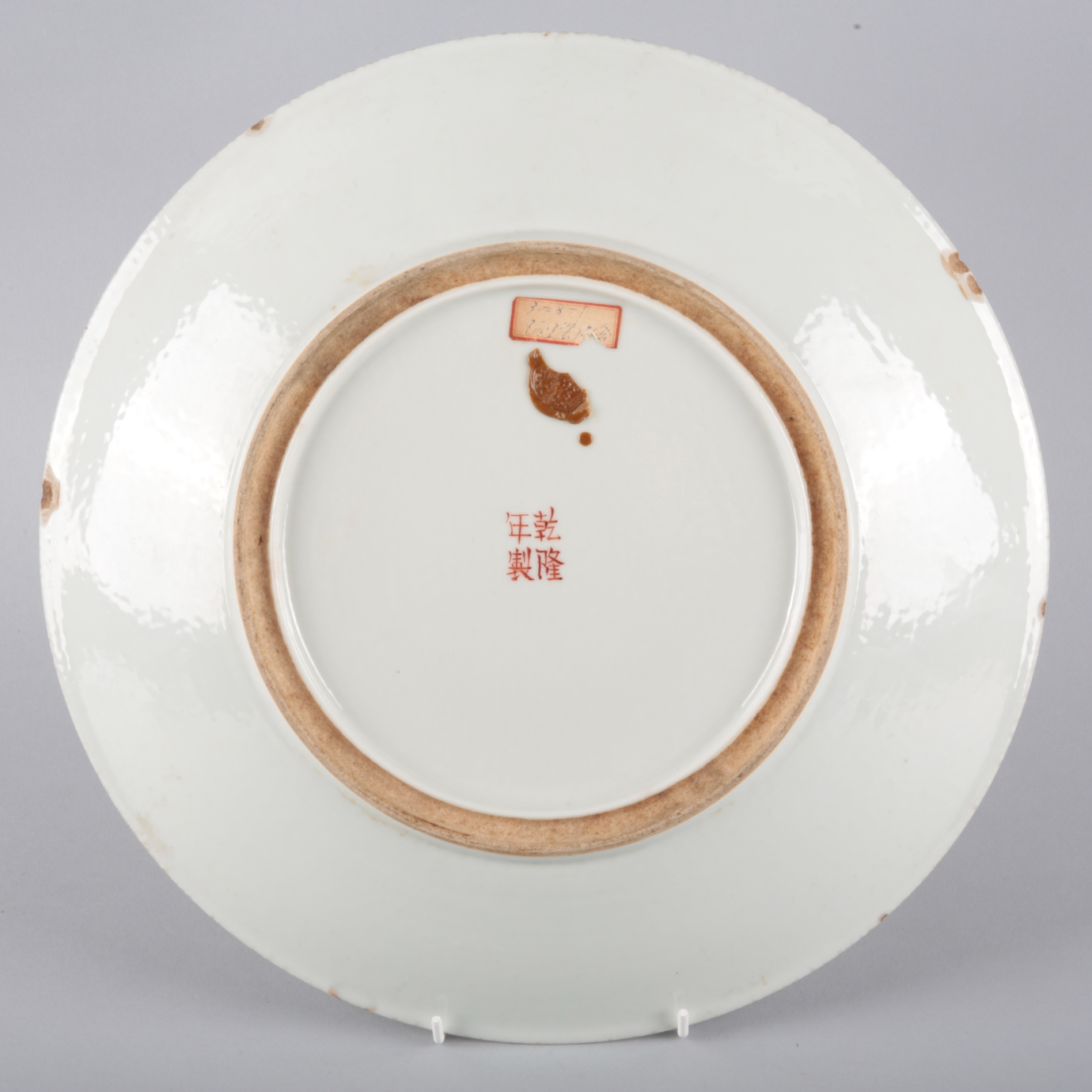 bearing a four character Qianlong mark to the base, 20th century, with everted rim and grooved foot rim, decorated with flowers in bloom, 33cm diameter